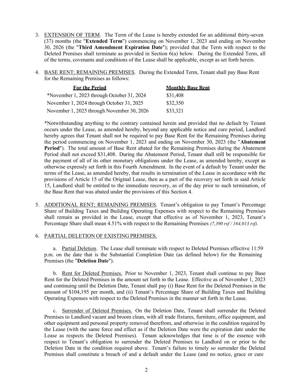 2 3. EXTENSION OF TERM. The Term of the Lease is hereby extended for an additional thirty-seven (37) months (the "Extended Term") commencing on November 1, 2023 and ending on November 30, 2026 (the "Third Amendment Expiration Date"); provided that the Term with respect to the Deleted Premises shall terminate as provided in Section 6(a) below. During the Extended Term, all of the terms, covenants and conditions of the Lease shall be applicable, except as set forth herein. 4. BASE RENT; REMAINING PREMISES. During the Extended Term, Tenant shall pay Base Rent for the Remaining Premises as follows: For the Period Monthly Base Rent *November 1, 2023 through October 31, 2024 $31,408 November 1, 2024 through October 31, 2025 $32,350 November 1, 2025 through November 30, 2026 $33,321 *Notwithstanding anything to the contrary contained herein and provided that no default by Tenant occurs under the Lease, as amended hereby, beyond any applicable notice and cure period, Landlord hereby agrees that Tenant shall not be required to pay Base Rent for the Remaining Premises during the period commencing on November 1, 2023 and ending on November 30, 2023 (the "Abatement Period"). The total amount of Base Rent abated for the Remaining Premises during the Abatement Period shall not exceed $31,408. During the Abatement Period, Tenant shall still be responsible for the payment of all of its other monetary obligations under the Lease, as amended hereby, except as otherwise expressly set forth in this Fourth Amendment. In the event of a default by Tenant under the terms of the Lease, as amended hereby, that results in termination of the Lease in accordance with the provisions of Article 15 of the Original Lease, then as a part of the recovery set forth in said Article 15, Landlord shall be entitled to the immediate recovery, as of the day prior to such termination, of the Base Rent that was abated under the provisions of this Section 4. 5. ADDITIONAL RENT; REMAINING PREMISES. Tenant’s obligation to pay Tenant’s Percentage Share of Building Taxes and Building Operating Expenses with respect to the Remaining Premises shall remain as provided in the Lease, except that effective as of November 1, 2023, Tenant’s Percentage Share shall mean 4.51% with respect to the Remaining Premises (7,390 rsf / 164,013 rsf). 6. PARTIAL DELETION OF EXISTING PREMISES. a. Partial Deletion. The Lease shall terminate with respect to Deleted Premises effective 11:59 p.m. on the date that is the Substantial Completion Date (as defined below) for the Remaining Premises (the "Deletion Date"). b. Rent for Deleted Premises. Prior to November 1, 2023, Tenant shall continue to pay Base Rent for the Deleted Premises in the amount set forth in the Lease. Effective as of November 1, 2023 and continuing until the Deletion Date, Tenant shall pay (i) Base Rent for the Deleted Premises in the amount of $104,195 per month, and (ii) Tenant’s Percentage Share of Building Taxes and Building Operating Expenses with respect to the Deleted Premises in the manner set forth in the Lease. c. Surrender of Deleted Premises. On the Deletion Date, Tenant shall surrender the Deleted Premises to Landlord vacant and broom clean, with all trade fixtures, furniture, office equipment, and other equipment and personal property removed therefrom, and otherwise in the condition required by the Lease (with the same force and effect as if the Deletion Date were the expiration date under the Lease as respects the Deleted Premises). Tenant acknowledges that time is of the essence with respect to Tenant’s obligation to surrender the Deleted Premises to Landlord on or prior to the Deletion Date in the condition required above. Tenant’s failure to timely so surrender the Deleted Premises shall constitute a breach of and a default under the Lease (and no notice, grace or cure