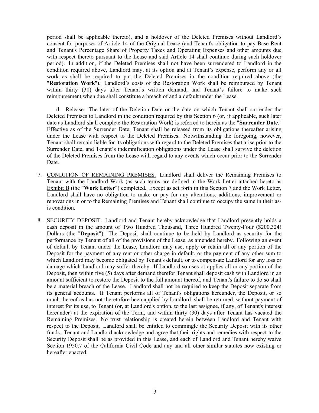 3 period shall be applicable thereto), and a holdover of the Deleted Premises without Landlord’s consent for purposes of Article 14 of the Original Lease (and Tenant's obligation to pay Base Rent and Tenant's Percentage Share of Property Taxes and Operating Expenses and other amounts due with respect thereto pursuant to the Lease and said Article 14 shall continue during such holdover period). In addition, if the Deleted Premises shall not have been surrendered to Landlord in the condition required above, Landlord may, at its option and at Tenant’s expense, perform any or all work as shall be required to put the Deleted Premises in the condition required above (the "Restoration Work"). Landlord’s costs of the Restoration Work shall be reimbursed by Tenant within thirty (30) days after Tenant’s written demand, and Tenant’s failure to make such reimbursement when due shall constitute a breach of and a default under the Lease. d. Release. The later of the Deletion Date or the date on which Tenant shall surrender the Deleted Premises to Landlord in the condition required by this Section 6 (or, if applicable, such later date as Landlord shall complete the Restoration Work) is referred to herein as the "Surrender Date." Effective as of the Surrender Date, Tenant shall be released from its obligations thereafter arising under the Lease with respect to the Deleted Premises. Notwithstanding the foregoing, however, Tenant shall remain liable for its obligations with regard to the Deleted Premises that arise prior to the Surrender Date, and Tenant’s indemnification obligations under the Lease shall survive the deletion of the Deleted Premises from the Lease with regard to any events which occur prior to the Surrender Date. 7. CONDITION OF REMAINING PREMISES. Landlord shall deliver the Remaining Premises to Tenant with the Landlord Work (as such terms are defined in the Work Letter attached hereto as Exhibit B (the "Work Letter") completed. Except as set forth in this Section 7 and the Work Letter, Landlord shall have no obligation to make or pay for any alterations, additions, improvement or renovations in or to the Remaining Premises and Tenant shall continue to occupy the same in their as- is condition. 8. SECURITY DEPOSIT. Landlord and Tenant hereby acknowledge that Landlord presently holds a cash deposit in the amount of Two Hundred Thousand, Three Hundred Twenty-Four ($200,324) Dollars (the "Deposit"). The Deposit shall continue to be held by Landlord as security for the performance by Tenant of all of the provisions of the Lease, as amended hereby. Following an event of default by Tenant under the Lease, Landlord may use, apply or retain all or any portion of the Deposit for the payment of any rent or other charge in default, or the payment of any other sum to which Landlord may become obligated by Tenant's default, or to compensate Landlord for any loss or damage which Landlord may suffer thereby. If Landlord so uses or applies all or any portion of the Deposit, then within five (5) days after demand therefor Tenant shall deposit cash with Landlord in an amount sufficient to restore the Deposit to the full amount thereof, and Tenant's failure to do so shall be a material breach of the Lease. Landlord shall not be required to keep the Deposit separate from its general accounts. If Tenant performs all of Tenant's obligations hereunder, the Deposit, or so much thereof as has not theretofore been applied by Landlord, shall be returned, without payment of interest for its use, to Tenant (or, at Landlord's option, to the last assignee, if any, of Tenant's interest hereunder) at the expiration of the Term, and within thirty (30) days after Tenant has vacated the Remaining Premises. No trust relationship is created herein between Landlord and Tenant with respect to the Deposit. Landlord shall be entitled to commingle the Security Deposit with its other funds. Tenant and Landlord acknowledge and agree that their rights and remedies with respect to the Security Deposit shall be as provided in this Lease, and each of Landlord and Tenant hereby waive Section 1950.7 of the California Civil Code and any and all other similar statutes now existing or hereafter enacted.