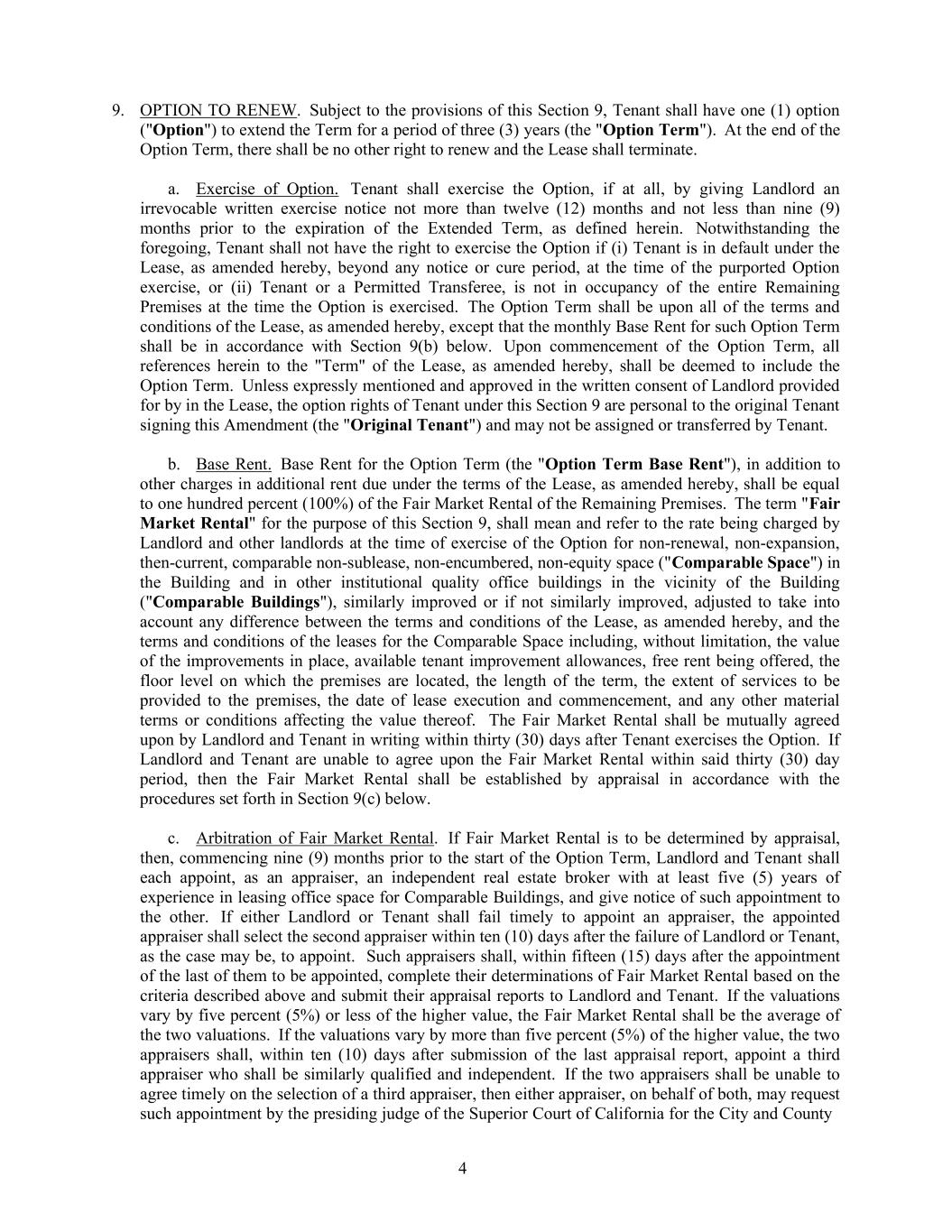 4 9. OPTION TO RENEW. Subject to the provisions of this Section 9, Tenant shall have one (1) option ("Option") to extend the Term for a period of three (3) years (the "Option Term"). At the end of the Option Term, there shall be no other right to renew and the Lease shall terminate. a. Exercise of Option. Tenant shall exercise the Option, if at all, by giving Landlord an irrevocable written exercise notice not more than twelve (12) months and not less than nine (9) months prior to the expiration of the Extended Term, as defined herein. Notwithstanding the foregoing, Tenant shall not have the right to exercise the Option if (i) Tenant is in default under the Lease, as amended hereby, beyond any notice or cure period, at the time of the purported Option exercise, or (ii) Tenant or a Permitted Transferee, is not in occupancy of the entire Remaining Premises at the time the Option is exercised. The Option Term shall be upon all of the terms and conditions of the Lease, as amended hereby, except that the monthly Base Rent for such Option Term shall be in accordance with Section 9(b) below. Upon commencement of the Option Term, all references herein to the "Term" of the Lease, as amended hereby, shall be deemed to include the Option Term. Unless expressly mentioned and approved in the written consent of Landlord provided for by in the Lease, the option rights of Tenant under this Section 9 are personal to the original Tenant signing this Amendment (the "Original Tenant") and may not be assigned or transferred by Tenant. b. Base Rent. Base Rent for the Option Term (the "Option Term Base Rent"), in addition to other charges in additional rent due under the terms of the Lease, as amended hereby, shall be equal to one hundred percent (100%) of the Fair Market Rental of the Remaining Premises. The term "Fair Market Rental" for the purpose of this Section 9, shall mean and refer to the rate being charged by Landlord and other landlords at the time of exercise of the Option for non-renewal, non-expansion, then-current, comparable non-sublease, non-encumbered, non-equity space ("Comparable Space") in the Building and in other institutional quality office buildings in the vicinity of the Building ("Comparable Buildings"), similarly improved or if not similarly improved, adjusted to take into account any difference between the terms and conditions of the Lease, as amended hereby, and the terms and conditions of the leases for the Comparable Space including, without limitation, the value of the improvements in place, available tenant improvement allowances, free rent being offered, the floor level on which the premises are located, the length of the term, the extent of services to be provided to the premises, the date of lease execution and commencement, and any other material terms or conditions affecting the value thereof. The Fair Market Rental shall be mutually agreed upon by Landlord and Tenant in writing within thirty (30) days after Tenant exercises the Option. If Landlord and Tenant are unable to agree upon the Fair Market Rental within said thirty (30) day period, then the Fair Market Rental shall be established by appraisal in accordance with the procedures set forth in Section 9(c) below. c. Arbitration of Fair Market Rental. If Fair Market Rental is to be determined by appraisal, then, commencing nine (9) months prior to the start of the Option Term, Landlord and Tenant shall each appoint, as an appraiser, an independent real estate broker with at least five (5) years of experience in leasing office space for Comparable Buildings, and give notice of such appointment to the other. If either Landlord or Tenant shall fail timely to appoint an appraiser, the appointed appraiser shall select the second appraiser within ten (10) days after the failure of Landlord or Tenant, as the case may be, to appoint. Such appraisers shall, within fifteen (15) days after the appointment of the last of them to be appointed, complete their determinations of Fair Market Rental based on the criteria described above and submit their appraisal reports to Landlord and Tenant. If the valuations vary by five percent (5%) or less of the higher value, the Fair Market Rental shall be the average of the two valuations. If the valuations vary by more than five percent (5%) of the higher value, the two appraisers shall, within ten (10) days after submission of the last appraisal report, appoint a third appraiser who shall be similarly qualified and independent. If the two appraisers shall be unable to agree timely on the selection of a third appraiser, then either appraiser, on behalf of both, may request such appointment by the presiding judge of the Superior Court of California for the City and County