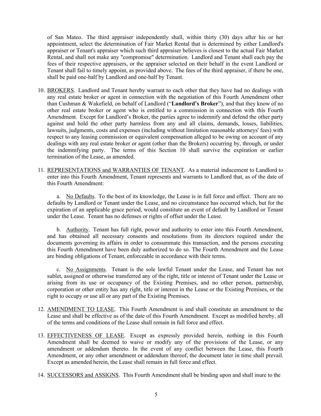 5 of San Mateo. The third appraiser independently shall, within thirty (30) days after his or her appointment, select the determination of Fair Market Rental that is determined by either Landlord's appraiser or Tenant's appraiser which such third appraiser believes is closest to the actual Fair Market Rental, and shall not make any "compromise" determination. Landlord and Tenant shall each pay the fees of their respective appraisers, or the appraiser selected on their behalf in the event Landlord or Tenant shall fail to timely appoint, as provided above. The fees of the third appraiser, if there be one, shall be paid one-half by Landlord and one-half by Tenant. 10. BROKERS. Landlord and Tenant hereby warrant to each other that they have had no dealings with any real estate broker or agent in connection with the negotiation of this Fourth Amendment other than Cushman & Wakefield, on behalf of Landlord (“Landlord’s Broker”), and that they know of no other real estate broker or agent who is entitled to a commission in connection with this Fourth Amendment. Except for Landlord’s Broker, the parties agree to indemnify and defend the other party against and hold the other party harmless from any and all claims, demands, losses, liabilities, lawsuits, judgments, costs and expenses (including without limitation reasonable attorneys' fees) with respect to any leasing commission or equivalent compensation alleged to be owing on account of any dealings with any real estate broker or agent (other than the Brokers) occurring by, through, or under the indemnifying party. The terms of this Section 10 shall survive the expiration or earlier termination of the Lease, as amended. 11. REPRESENTATIONS and WARRANTIES OF TENANT. As a material inducement to Landlord to enter into this Fourth Amendment, Tenant represents and warrants to Landlord that, as of the date of this Fourth Amendment: a. No Defaults. To the best of its knowledge, the Lease is in full force and effect. There are no defaults by Landlord or Tenant under the Lease, and no circumstance has occurred which, but for the expiration of an applicable grace period, would constitute an event of default by Landlord or Tenant under the Lease. Tenant has no defenses or rights of offset under the Lease. b. Authority. Tenant has full right, power and authority to enter into this Fourth Amendment, and has obtained all necessary consents and resolutions from its directors required under the documents governing its affairs in order to consummate this transaction, and the persons executing this Fourth Amendment have been duly authorized to do so. The Fourth Amendment and the Lease are binding obligations of Tenant, enforceable in accordance with their terms. c. No Assignments. Tenant is the sole lawful Tenant under the Lease, and Tenant has not sublet, assigned or otherwise transferred any of the right, title or interest of Tenant under the Lease or arising from its use or occupancy of the Existing Premises, and no other person, partnership, corporation or other entity has any right, title or interest in the Lease or the Existing Premises, or the right to occupy or use all or any part of the Existing Premises. 12. AMENDMENT TO LEASE. This Fourth Amendment is and shall constitute an amendment to the Lease and shall be effective as of the date of this Fourth Amendment. Except as modified hereby, all of the terms and conditions of the Lease shall remain in full force and effect. 13. EFFECTIVENESS OF LEASE. Except as expressly provided herein, nothing in this Fourth Amendment shall be deemed to waive or modify any of the provisions of the Lease, or any amendment or addendum thereto. In the event of any conflict between the Lease, this Fourth Amendment, or any other amendment or addendum thereof, the document later in time shall prevail. Except as amended herein, the Lease shall remain in full force and effect. 14. SUCCESSORS and ASSIGNS. This Fourth Amendment shall be binding upon and shall inure to the