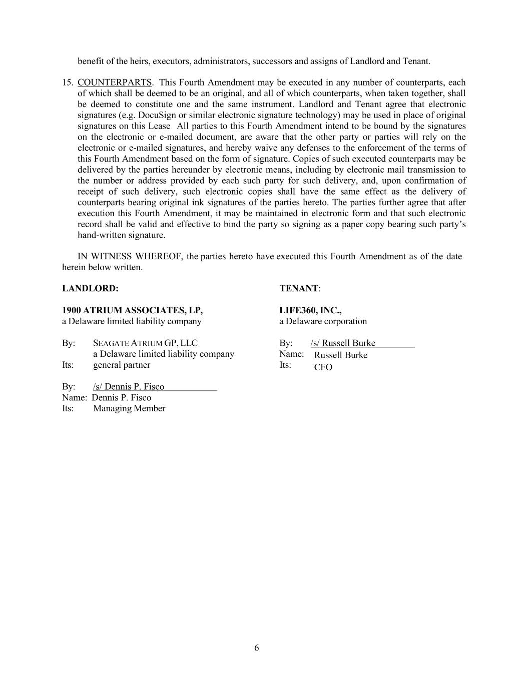 6 benefit of the heirs, executors, administrators, successors and assigns of Landlord and Tenant. 15. COUNTERPARTS. This Fourth Amendment may be executed in any number of counterparts, each of which shall be deemed to be an original, and all of which counterparts, when taken together, shall be deemed to constitute one and the same instrument. Landlord and Tenant agree that electronic signatures (e.g. DocuSign or similar electronic signature technology) may be used in place of original signatures on this Lease All parties to this Fourth Amendment intend to be bound by the signatures on the electronic or e-mailed document, are aware that the other party or parties will rely on the electronic or e-mailed signatures, and hereby waive any defenses to the enforcement of the terms of this Fourth Amendment based on the form of signature. Copies of such executed counterparts may be delivered by the parties hereunder by electronic means, including by electronic mail transmission to the number or address provided by each such party for such delivery, and, upon confirmation of receipt of such delivery, such electronic copies shall have the same effect as the delivery of counterparts bearing original ink signatures of the parties hereto. The parties further agree that after execution this Fourth Amendment, it may be maintained in electronic form and that such electronic record shall be valid and effective to bind the party so signing as a paper copy bearing such party’s hand-written signature. IN WITNESS WHEREOF, the parties hereto have executed this Fourth Amendment as of the date herein below written. LANDLORD: TENANT: 1900 ATRIUM ASSOCIATES, LP, LIFE360, INC., a Delaware limited liability company a Delaware corporation By: SEAGATE ATRIUM GP, LLC By: /s/ Russell Burke a Delaware limited liability company Name: Its: general partner Its: By: /s/ Dennis P. Fisco Name: Dennis P. Fisco Its: Managing Member Russell Burke CFO