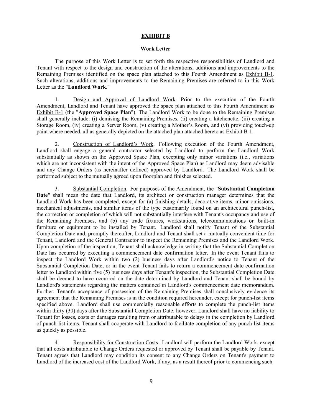 9 EXHIBIT B Work Letter The purpose of this Work Letter is to set forth the respective responsibilities of Landlord and Tenant with respect to the design and construction of the alterations, additions and improvements to the Remaining Premises identified on the space plan attached to this Fourth Amendment as Exhibit B-1. Such alterations, additions and improvements to the Remaining Premises are referred to in this Work Letter as the "Landlord Work." 1. Design and Approval of Landlord Work. Prior to the execution of the Fourth Amendment, Landlord and Tenant have approved the space plan attached to this Fourth Amendment as Exhibit B-1 (the "Approved Space Plan"). The Landlord Work to be done to the Remaining Premises shall generally include: (i) demising the Remaining Premises, (ii) creating a kitchenette, (iii) creating a Storage Room, (iv) creating a Server Room, (v) creating a Mother’s Room, and (vi) providing touch-up paint where needed, all as generally depicted on the attached plan attached hereto as Exhibit B-1. 2. Construction of Landlord’s Work. Following execution of the Fourth Amendment, Landlord shall engage a general contractor selected by Landlord to perform the Landlord Work substantially as shown on the Approved Space Plan, excepting only minor variations (i.e., variations which are not inconsistent with the intent of the Approved Space Plan) as Landlord may deem advisable and any Change Orders (as hereinafter defined) approved by Landlord. The Landlord Work shall be performed subject to the mutually agreed upon floorplan and finishes selected. 3. Substantial Completion. For purposes of the Amendment, the "Substantial Completion Date" shall mean the date that Landlord, its architect or construction manager determines that the Landlord Work has been completed, except for (a) finishing details, decorative items, minor omissions, mechanical adjustments, and similar items of the type customarily found on an architectural punch-list, the correction or completion of which will not substantially interfere with Tenant's occupancy and use of the Remaining Premises, and (b) any trade fixtures, workstations, telecommunications or built-in furniture or equipment to be installed by Tenant. Landlord shall notify Tenant of the Substantial Completion Date and, promptly thereafter, Landlord and Tenant shall set a mutually convenient time for Tenant, Landlord and the General Contractor to inspect the Remaining Premises and the Landlord Work. Upon completion of the inspection, Tenant shall acknowledge in writing that the Substantial Completion Date has occurred by executing a commencement date confirmation letter. In the event Tenant fails to inspect the Landlord Work within two (2) business days after Landlord's notice to Tenant of the Substantial Completion Date, or in the event Tenant fails to return a commencement date confirmation letter to Landlord within five (5) business days after Tenant's inspection, the Substantial Completion Date shall be deemed to have occurred on the date determined by Landlord and Tenant shall be bound by Landlord's statements regarding the matters contained in Landlord's commencement date memorandum. Further, Tenant's acceptance of possession of the Remaining Premises shall conclusively evidence its agreement that the Remaining Premises is in the condition required hereunder, except for punch-list items specified above. Landlord shall use commercially reasonable efforts to complete the punch-list items within thirty (30) days after the Substantial Completion Date; however, Landlord shall have no liability to Tenant for losses, costs or damages resulting from or attributable to delays in the completion by Landlord of punch-list items. Tenant shall cooperate with Landlord to facilitate completion of any punch-list items as quickly as possible. 4. Responsibility for Construction Costs. Landlord will perform the Landlord Work, except that all costs attributable to Change Orders requested or approved by Tenant shall be payable by Tenant. Tenant agrees that Landlord may condition its consent to any Change Orders on Tenant's payment to Landlord of the increased cost of the Landlord Work, if any, as a result thereof prior to commencing such