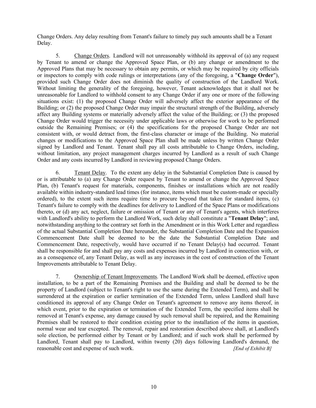10 Change Orders. Any delay resulting from Tenant's failure to timely pay such amounts shall be a Tenant Delay. 5. Change Orders. Landlord will not unreasonably withhold its approval of (a) any request by Tenant to amend or change the Approved Space Plan, or (b) any change or amendment to the Approved Plans that may be necessary to obtain any permits, or which may be required by city officials or inspectors to comply with code rulings or interpretations (any of the foregoing, a "Change Order"), provided such Change Order does not diminish the quality of construction of the Landlord Work. Without limiting the generality of the foregoing, however, Tenant acknowledges that it shall not be unreasonable for Landlord to withhold consent to any Change Order if any one or more of the following situations exist: (1) the proposed Change Order will adversely affect the exterior appearance of the Building; or (2) the proposed Change Order may impair the structural strength of the Building, adversely affect any Building systems or materially adversely affect the value of the Building; or (3) the proposed Change Order would trigger the necessity under applicable laws or otherwise for work to be performed outside the Remaining Premises; or (4) the specifications for the proposed Change Order are not consistent with, or would detract from, the first-class character or image of the Building. No material changes or modifications to the Approved Space Plan shall be made unless by written Change Order signed by Landlord and Tenant. Tenant shall pay all costs attributable to Change Orders, including, without limitation, any project management charges incurred by Landlord as a result of such Change Order and any costs incurred by Landlord in reviewing proposed Change Orders. 6. Tenant Delay. To the extent any delay in the Substantial Completion Date is caused by or is attributable to (a) any Change Order request by Tenant to amend or change the Approved Space Plan, (b) Tenant's request for materials, components, finishes or installations which are not readily available within industry-standard lead times (for instance, items which must be custom-made or specially ordered), to the extent such items require time to procure beyond that taken for standard items, (c) Tenant's failure to comply with the deadlines for delivery to Landlord of the Space Plans or modifications thereto, or (d) any act, neglect, failure or omission of Tenant or any of Tenant's agents, which interferes with Landlord's ability to perform the Landlord Work, such delay shall constitute a "Tenant Delay"; and, notwithstanding anything to the contrary set forth in the Amendment or in this Work Letter and regardless of the actual Substantial Completion Date hereunder, the Substantial Completion Date and the Expansion Commencement Date shall be deemed to be the date the Substantial Completion Date and Commencement Date, respectively, would have occurred if no Tenant Delay(s) had occurred. Tenant shall be responsible for and shall pay any costs and expenses incurred by Landlord in connection with, or as a consequence of, any Tenant Delay, as well as any increases in the cost of construction of the Tenant Improvements attributable to Tenant Delay. 7. Ownership of Tenant Improvements. The Landlord Work shall be deemed, effective upon installation, to be a part of the Remaining Premises and the Building and shall be deemed to be the property of Landlord (subject to Tenant's right to use the same during the Extended Term), and shall be surrendered at the expiration or earlier termination of the Extended Term, unless Landlord shall have conditioned its approval of any Change Order on Tenant's agreement to remove any items thereof, in which event, prior to the expiration or termination of the Extended Term, the specified items shall be removed at Tenant's expense, any damage caused by such removal shall be repaired, and the Remaining Premises shall be restored to their condition existing prior to the installation of the items in question, normal wear and tear excepted. The removal, repair and restoration described above shall, at Landlord's sole election, be performed either by Tenant or by Landlord; and if such work shall be performed by Landlord, Tenant shall pay to Landlord, within twenty (20) days following Landlord's demand, the reasonable cost and expense of such work. [End of Exhibit B]