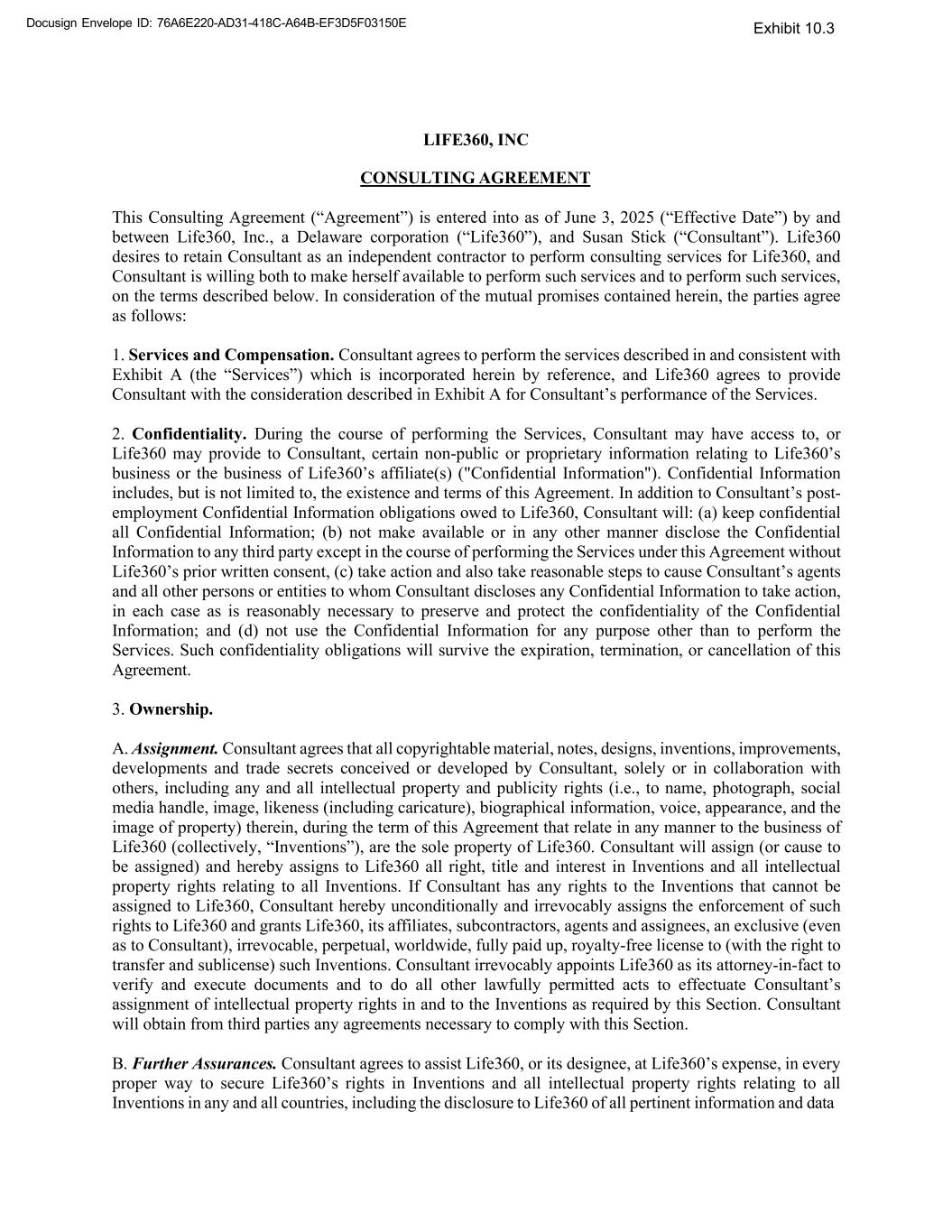 Docusign Envelope ID: 76A6E220-AD31-418C-A64B-EF3D5F03150E LIFE360, INC CONSULTING AGREEMENT This Consulting Agreement (“Agreement”) is entered into as of June 3, 2025 (“Effective Date”) by and between Life360, Inc., a Delaware corporation (“Life360”), and Susan Stick (“Consultant”). Life360 desires to retain Consultant as an independent contractor to perform consulting services for Life360, and Consultant is willing both to make herself available to perform such services and to perform such services, on the terms described below. In consideration of the mutual promises contained herein, the parties agree as follows: 1. Services and Compensation. Consultant agrees to perform the services described in and consistent with Exhibit A (the “Services”) which is incorporated herein by reference, and Life360 agrees to provide Consultant with the consideration described in Exhibit A for Consultant’s performance of the Services. 2. Confidentiality. During the course of performing the Services, Consultant may have access to, or Life360 may provide to Consultant, certain non-public or proprietary information relating to Life360’s business or the business of Life360’s affiliate(s) ("Confidential Information"). Confidential Information includes, but is not limited to, the existence and terms of this Agreement. In addition to Consultant’s post- employment Confidential Information obligations owed to Life360, Consultant will: (a) keep confidential all Confidential Information; (b) not make available or in any other manner disclose the Confidential Information to any third party except in the course of performing the Services under this Agreement without Life360’s prior written consent, (c) take action and also take reasonable steps to cause Consultant’s agents and all other persons or entities to whom Consultant discloses any Confidential Information to take action, in each case as is reasonably necessary to preserve and protect the confidentiality of the Confidential Information; and (d) not use the Confidential Information for any purpose other than to perform the Services. Such confidentiality obligations will survive the expiration, termination, or cancellation of this Agreement. 3. Ownership. A. Assignment. Consultant agrees that all copyrightable material, notes, designs, inventions, improvements, developments and trade secrets conceived or developed by Consultant, solely or in collaboration with others, including any and all intellectual property and publicity rights (i.e., to name, photograph, social media handle, image, likeness (including caricature), biographical information, voice, appearance, and the image of property) therein, during the term of this Agreement that relate in any manner to the business of Life360 (collectively, “Inventions”), are the sole property of Life360. Consultant will assign (or cause to be assigned) and hereby assigns to Life360 all right, title and interest in Inventions and all intellectual property rights relating to all Inventions. If Consultant has any rights to the Inventions that cannot be assigned to Life360, Consultant hereby unconditionally and irrevocably assigns the enforcement of such rights to Life360 and grants Life360, its affiliates, subcontractors, agents and assignees, an exclusive (even as to Consultant), irrevocable, perpetual, worldwide, fully paid up, royalty-free license to (with the right to transfer and sublicense) such Inventions. Consultant irrevocably appoints Life360 as its attorney-in-fact to verify and execute documents and to do all other lawfully permitted acts to effectuate Consultant’s assignment of intellectual property rights in and to the Inventions as required by this Section. Consultant will obtain from third parties any agreements necessary to comply with this Section. B. Further Assurances. Consultant agrees to assist Life360, or its designee, at Life360’s expense, in every proper way to secure Life360’s rights in Inventions and all intellectual property rights relating to all Inventions in any and all countries, including the disclosure to Life360 of all pertinent information and data Exhibit 10.3