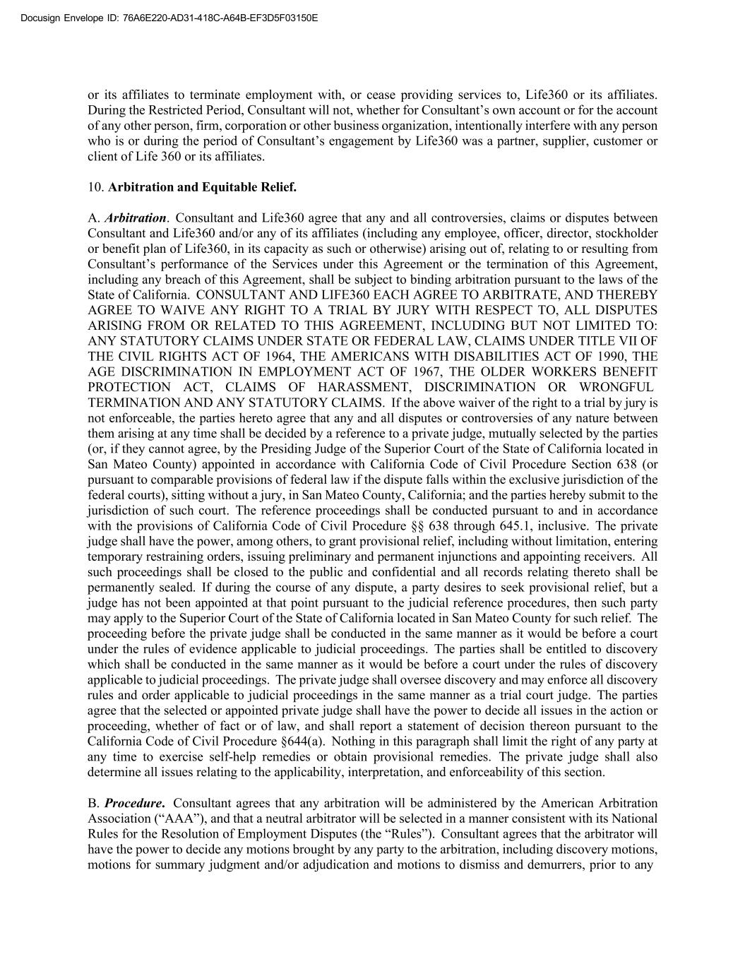 Docusign Envelope ID: 76A6E220-AD31-418C-A64B-EF3D5F03150E or its affiliates to terminate employment with, or cease providing services to, Life360 or its affiliates. During the Restricted Period, Consultant will not, whether for Consultant’s own account or for the account of any other person, firm, corporation or other business organization, intentionally interfere with any person who is or during the period of Consultant’s engagement by Life360 was a partner, supplier, customer or client of Life 360 or its affiliates. 10. Arbitration and Equitable Relief. A. Arbitration. Consultant and Life360 agree that any and all controversies, claims or disputes between Consultant and Life360 and/or any of its affiliates (including any employee, officer, director, stockholder or benefit plan of Life360, in its capacity as such or otherwise) arising out of, relating to or resulting from Consultant’s performance of the Services under this Agreement or the termination of this Agreement, including any breach of this Agreement, shall be subject to binding arbitration pursuant to the laws of the State of California. CONSULTANT AND LIFE360 EACH AGREE TO ARBITRATE, AND THEREBY AGREE TO WAIVE ANY RIGHT TO A TRIAL BY JURY WITH RESPECT TO, ALL DISPUTES ARISING FROM OR RELATED TO THIS AGREEMENT, INCLUDING BUT NOT LIMITED TO: ANY STATUTORY CLAIMS UNDER STATE OR FEDERAL LAW, CLAIMS UNDER TITLE VII OF THE CIVIL RIGHTS ACT OF 1964, THE AMERICANS WITH DISABILITIES ACT OF 1990, THE AGE DISCRIMINATION IN EMPLOYMENT ACT OF 1967, THE OLDER WORKERS BENEFIT PROTECTION ACT, CLAIMS OF HARASSMENT, DISCRIMINATION OR WRONGFUL TERMINATION AND ANY STATUTORY CLAIMS. If the above waiver of the right to a trial by jury is not enforceable, the parties hereto agree that any and all disputes or controversies of any nature between them arising at any time shall be decided by a reference to a private judge, mutually selected by the parties (or, if they cannot agree, by the Presiding Judge of the Superior Court of the State of California located in San Mateo County) appointed in accordance with California Code of Civil Procedure Section 638 (or pursuant to comparable provisions of federal law if the dispute falls within the exclusive jurisdiction of the federal courts), sitting without a jury, in San Mateo County, California; and the parties hereby submit to the jurisdiction of such court. The reference proceedings shall be conducted pursuant to and in accordance with the provisions of California Code of Civil Procedure §§ 638 through 645.1, inclusive. The private judge shall have the power, among others, to grant provisional relief, including without limitation, entering temporary restraining orders, issuing preliminary and permanent injunctions and appointing receivers. All such proceedings shall be closed to the public and confidential and all records relating thereto shall be permanently sealed. If during the course of any dispute, a party desires to seek provisional relief, but a judge has not been appointed at that point pursuant to the judicial reference procedures, then such party may apply to the Superior Court of the State of California located in San Mateo County for such relief. The proceeding before the private judge shall be conducted in the same manner as it would be before a court under the rules of evidence applicable to judicial proceedings. The parties shall be entitled to discovery which shall be conducted in the same manner as it would be before a court under the rules of discovery applicable to judicial proceedings. The private judge shall oversee discovery and may enforce all discovery rules and order applicable to judicial proceedings in the same manner as a trial court judge. The parties agree that the selected or appointed private judge shall have the power to decide all issues in the action or proceeding, whether of fact or of law, and shall report a statement of decision thereon pursuant to the California Code of Civil Procedure §644(a). Nothing in this paragraph shall limit the right of any party at any time to exercise self-help remedies or obtain provisional remedies. The private judge shall also determine all issues relating to the applicability, interpretation, and enforceability of this section. B. Procedure. Consultant agrees that any arbitration will be administered by the American Arbitration Association (“AAA”), and that a neutral arbitrator will be selected in a manner consistent with its National Rules for the Resolution of Employment Disputes (the “Rules”). Consultant agrees that the arbitrator will have the power to decide any motions brought by any party to the arbitration, including discovery motions, motions for summary judgment and/or adjudication and motions to dismiss and demurrers, prior to any