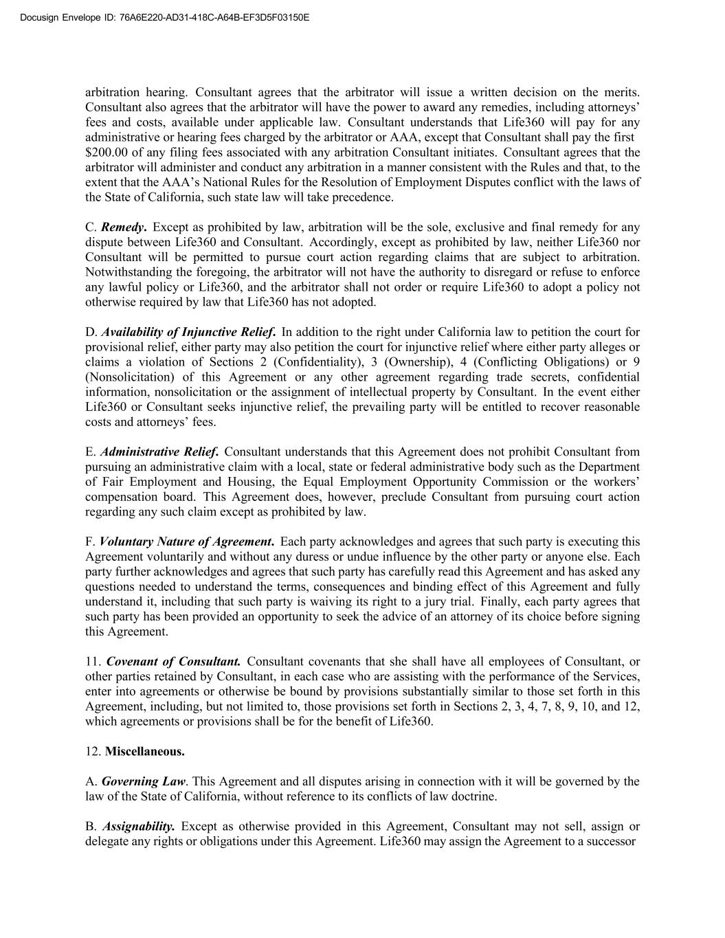 Docusign Envelope ID: 76A6E220-AD31-418C-A64B-EF3D5F03150E arbitration hearing. Consultant agrees that the arbitrator will issue a written decision on the merits. Consultant also agrees that the arbitrator will have the power to award any remedies, including attorneys’ fees and costs, available under applicable law. Consultant understands that Life360 will pay for any administrative or hearing fees charged by the arbitrator or AAA, except that Consultant shall pay the first $200.00 of any filing fees associated with any arbitration Consultant initiates. Consultant agrees that the arbitrator will administer and conduct any arbitration in a manner consistent with the Rules and that, to the extent that the AAA’s National Rules for the Resolution of Employment Disputes conflict with the laws of the State of California, such state law will take precedence. C. Remedy. Except as prohibited by law, arbitration will be the sole, exclusive and final remedy for any dispute between Life360 and Consultant. Accordingly, except as prohibited by law, neither Life360 nor Consultant will be permitted to pursue court action regarding claims that are subject to arbitration. Notwithstanding the foregoing, the arbitrator will not have the authority to disregard or refuse to enforce any lawful policy or Life360, and the arbitrator shall not order or require Life360 to adopt a policy not otherwise required by law that Life360 has not adopted. D. Availability of Injunctive Relief. In addition to the right under California law to petition the court for provisional relief, either party may also petition the court for injunctive relief where either party alleges or claims a violation of Sections 2 (Confidentiality), 3 (Ownership), 4 (Conflicting Obligations) or 9 (Nonsolicitation) of this Agreement or any other agreement regarding trade secrets, confidential information, nonsolicitation or the assignment of intellectual property by Consultant. In the event either Life360 or Consultant seeks injunctive relief, the prevailing party will be entitled to recover reasonable costs and attorneys’ fees. E. Administrative Relief. Consultant understands that this Agreement does not prohibit Consultant from pursuing an administrative claim with a local, state or federal administrative body such as the Department of Fair Employment and Housing, the Equal Employment Opportunity Commission or the workers’ compensation board. This Agreement does, however, preclude Consultant from pursuing court action regarding any such claim except as prohibited by law. F. Voluntary Nature of Agreement. Each party acknowledges and agrees that such party is executing this Agreement voluntarily and without any duress or undue influence by the other party or anyone else. Each party further acknowledges and agrees that such party has carefully read this Agreement and has asked any questions needed to understand the terms, consequences and binding effect of this Agreement and fully understand it, including that such party is waiving its right to a jury trial. Finally, each party agrees that such party has been provided an opportunity to seek the advice of an attorney of its choice before signing this Agreement. 11. Covenant of Consultant. Consultant covenants that she shall have all employees of Consultant, or other parties retained by Consultant, in each case who are assisting with the performance of the Services, enter into agreements or otherwise be bound by provisions substantially similar to those set forth in this Agreement, including, but not limited to, those provisions set forth in Sections 2, 3, 4, 7, 8, 9, 10, and 12, which agreements or provisions shall be for the benefit of Life360. 12. Miscellaneous. A. Governing Law. This Agreement and all disputes arising in connection with it will be governed by the law of the State of California, without reference to its conflicts of law doctrine. B. Assignability. Except as otherwise provided in this Agreement, Consultant may not sell, assign or delegate any rights or obligations under this Agreement. Life360 may assign the Agreement to a successor