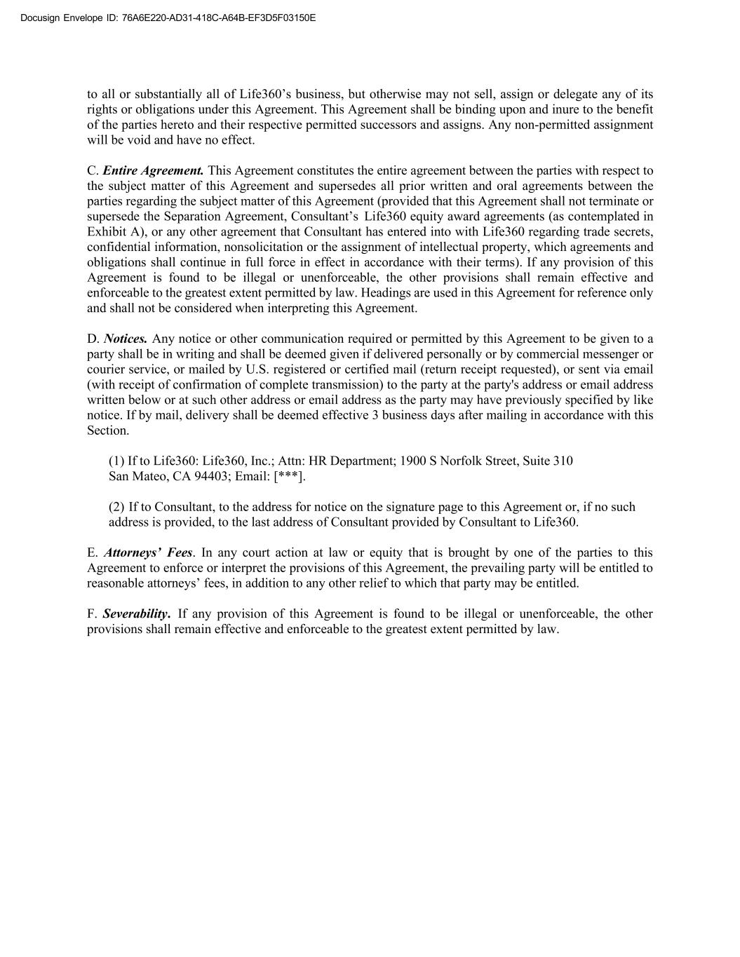 Docusign Envelope ID: 76A6E220-AD31-418C-A64B-EF3D5F03150E to all or substantially all of Life360’s business, but otherwise may not sell, assign or delegate any of its rights or obligations under this Agreement. This Agreement shall be binding upon and inure to the benefit of the parties hereto and their respective permitted successors and assigns. Any non-permitted assignment will be void and have no effect. C. Entire Agreement. This Agreement constitutes the entire agreement between the parties with respect to the subject matter of this Agreement and supersedes all prior written and oral agreements between the parties regarding the subject matter of this Agreement (provided that this Agreement shall not terminate or supersede the Separation Agreement, Consultant’s Life360 equity award agreements (as contemplated in Exhibit A), or any other agreement that Consultant has entered into with Life360 regarding trade secrets, confidential information, nonsolicitation or the assignment of intellectual property, which agreements and obligations shall continue in full force in effect in accordance with their terms). If any provision of this Agreement is found to be illegal or unenforceable, the other provisions shall remain effective and enforceable to the greatest extent permitted by law. Headings are used in this Agreement for reference only and shall not be considered when interpreting this Agreement. D. Notices. Any notice or other communication required or permitted by this Agreement to be given to a party shall be in writing and shall be deemed given if delivered personally or by commercial messenger or courier service, or mailed by U.S. registered or certified mail (return receipt requested), or sent via email (with receipt of confirmation of complete transmission) to the party at the party's address or email address written below or at such other address or email address as the party may have previously specified by like notice. If by mail, delivery shall be deemed effective 3 business days after mailing in accordance with this Section. (1) If to Life360: Life360, Inc.; Attn: HR Department; 1900 S Norfolk Street, Suite 310 San Mateo, CA 94403; Email: [***]. (2) If to Consultant, to the address for notice on the signature page to this Agreement or, if no such address is provided, to the last address of Consultant provided by Consultant to Life360. E. Attorneys’ Fees. In any court action at law or equity that is brought by one of the parties to this Agreement to enforce or interpret the provisions of this Agreement, the prevailing party will be entitled to reasonable attorneys’ fees, in addition to any other relief to which that party may be entitled. F. Severability. If any provision of this Agreement is found to be illegal or unenforceable, the other provisions shall remain effective and enforceable to the greatest extent permitted by law.