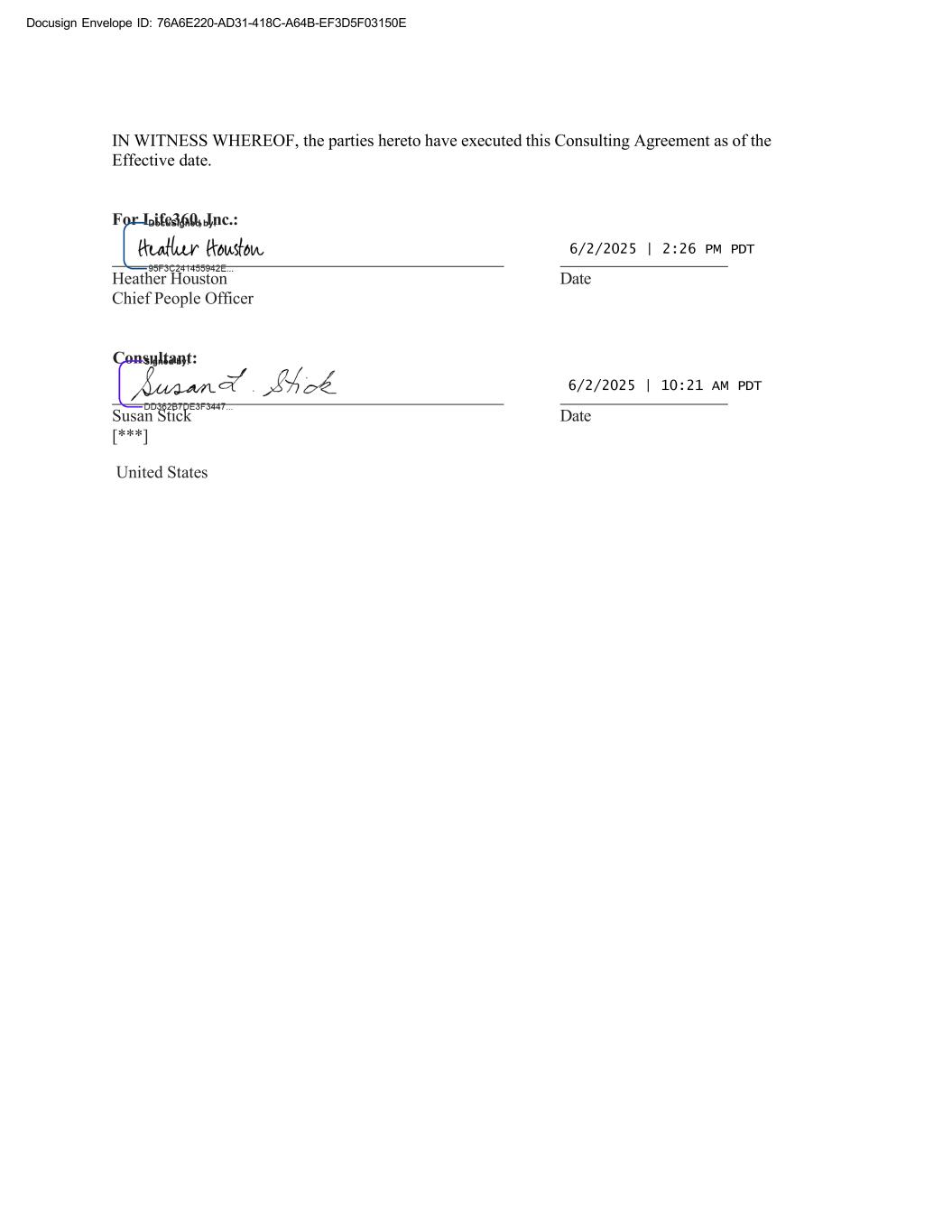 Docusign Envelope ID: 76A6E220-AD31-418C-A64B-EF3D5F03150E Consultant: For Life360, Inc.: IN WITNESS WHEREOF, the parties hereto have executed this Consulting Agreement as of the Effective date. 6/2/2025 | 2:26 PM PDT Heather Houston Date Chief People Officer 6/2/2025 | 10:21 AM PDT Susan Stick Date [***] United States