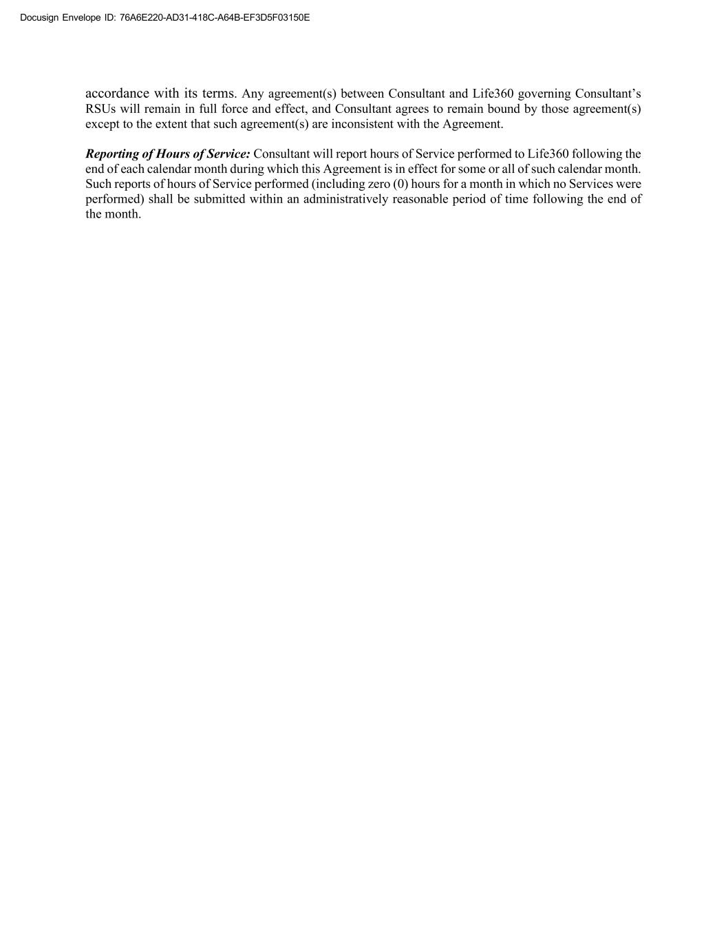 Docusign Envelope ID: 76A6E220-AD31-418C-A64B-EF3D5F03150E accordance with its terms. Any agreement(s) between Consultant and Life360 governing Consultant’s RSUs will remain in full force and effect, and Consultant agrees to remain bound by those agreement(s) except to the extent that such agreement(s) are inconsistent with the Agreement. Reporting of Hours of Service: Consultant will report hours of Service performed to Life360 following the end of each calendar month during which this Agreement is in effect for some or all of such calendar month. Such reports of hours of Service performed (including zero (0) hours for a month in which no Services were performed) shall be submitted within an administratively reasonable period of time following the end of the month.