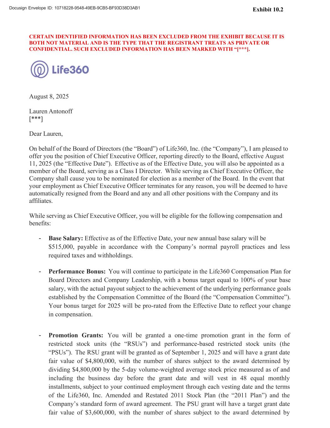 Docusign Envelope ID: 10718228-9548-49EB-9CB5-BF93D38D3AB1 CERTAIN IDENTIFIED INFORMATION HAS BEEN EXCLUDED FROM THE EXHIBIT BECAUSE IT IS BOTH NOT MATERIAL AND IS THE TYPE THAT THE REGISTRANT TREATS AS PRIVATE OR CONFIDENTIAL. SUCH EXCLUDED INFORMATION HAS BEEN MARKED WITH “[***]. August 8, 2025 Lauren Antonoff [***] Dear Lauren, On behalf of the Board of Directors (the “Board”) of Life360, Inc. (the “Company”), I am pleased to offer you the position of Chief Executive Officer, reporting directly to the Board, effective August 11, 2025 (the “Effective Date”). Effective as of the Effective Date, you will also be appointed as a member of the Board, serving as a Class I Director. While serving as Chief Executive Officer, the Company shall cause you to be nominated for election as a member of the Board. In the event that your employment as Chief Executive Officer terminates for any reason, you will be deemed to have automatically resigned from the Board and any and all other positions with the Company and its affiliates. While serving as Chief Executive Officer, you will be eligible for the following compensation and benefits: Exhibit 10.2 - Base Salary: Effective as of the Effective Date, your new annual base salary will be $515,000, payable in accordance with the Company’s normal payroll practices and less required taxes and withholdings. - Performance Bonus: You will continue to participate in the Life360 Compensation Plan for Board Directors and Company Leadership, with a bonus target equal to 100% of your base salary, with the actual payout subject to the achievement of the underlying performance goals established by the Compensation Committee of the Board (the “Compensation Committee”). Your bonus target for 2025 will be pro-rated from the Effective Date to reflect your change in compensation. - Promotion Grants: You will be granted a one-time promotion grant in the form of restricted stock units (the “RSUs”) and performance-based restricted stock units (the “PSUs”). The RSU grant will be granted as of September 1, 2025 and will have a grant date fair value of $4,800,000, with the number of shares subject to the award determined by dividing $4,800,000 by the 5-day volume-weighted average stock price measured as of and including the business day before the grant date and will vest in 48 equal monthly installments, subject to your continued employment through each vesting date and the terms of the Life360, Inc. Amended and Restated 2011 Stock Plan (the “2011 Plan”) and the Company’s standard form of award agreement. The PSU grant will have a target grant date fair value of $3,600,000, with the number of shares subject to the award determined by