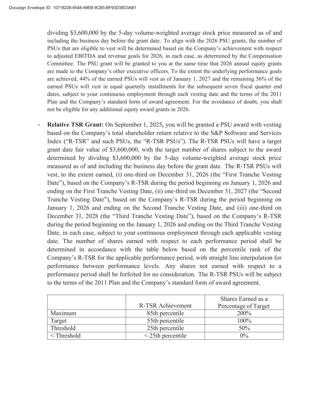 Docusign Envelope ID: 10718228-9548-49EB-9CB5-BF93D38D3AB1 R-TSR Achievement Shares Earned as a Percentage of Target Maximum 85th percentile 200% Target 55th percentile 100% Threshold 25th percentile 50% < Threshold < 25th percentile 0% dividing $3,600,000 by the 5-day volume-weighted average stock price measured as of and including the business day before the grant date. To align with the 2026 PSU grants, the number of PSUs that are eligible to vest will be determined based on the Company’s achievement with respect to adjusted EBITDA and revenue goals for 2026, in each case, as determined by the Compensation Committee. The PSU grant will be granted to you at the same time that 2026 annual equity grants are made to the Company’s other executive officers. To the extent the underlying performance goals are achieved, 44% of the earned PSUs will vest as of January 1, 2027 and the remaining 56% of the earned PSUs will vest in equal quarterly installments for the subsequent seven fiscal quarter end dates, subject to your continuous employment through each vesting date and the terms of the 2011 Plan and the Company’s standard form of award agreement. For the avoidance of doubt, you shall not be eligible for any additional equity award grants in 2026. - Relative TSR Grant: On September 1, 2025, you will be granted a PSU award with vesting based on the Company’s total shareholder return relative to the S&P Software and Services Index (“R-TSR” and such PSUs, the “R-TSR PSUs”). The R-TSR PSUs will have a target grant date fair value of $3,600,000, with the target number of shares subject to the award determined by dividing $3,600,000 by the 5-day volume-weighted average stock price measured as of and including the business day before the grant date. The R-TSR PSUs will vest, to the extent earned, (i) one-third on December 31, 2026 (the “First Tranche Vesting Date”), based on the Company’s R-TSR during the period beginning on January 1, 2026 and ending on the First Tranche Vesting Date, (ii) one-third on December 31, 2027 (the “Second Tranche Vesting Date”), based on the Company’s R-TSR during the period beginning on January 1, 2026 and ending on the Second Tranche Vesting Date, and (iii) one-third on December 31, 2028 (the “Third Tranche Vesting Date”), based on the Company’s R-TSR during the period beginning on the January 1, 2026 and ending on the Third Tranche Vesting Date, in each case, subject to your continuous employment through each applicable vesting date. The number of shares earned with respect to each performance period shall be determined in accordance with the table below based on the percentile rank of the Company’s R-TSR for the applicable performance period, with straight line interpolation for performance between performance levels. Any shares not earned with respect to a performance period shall be forfeited for no consideration. The R-TSR PSUs will be subject to the terms of the 2011 Plan and the Company’s standard form of award agreement.