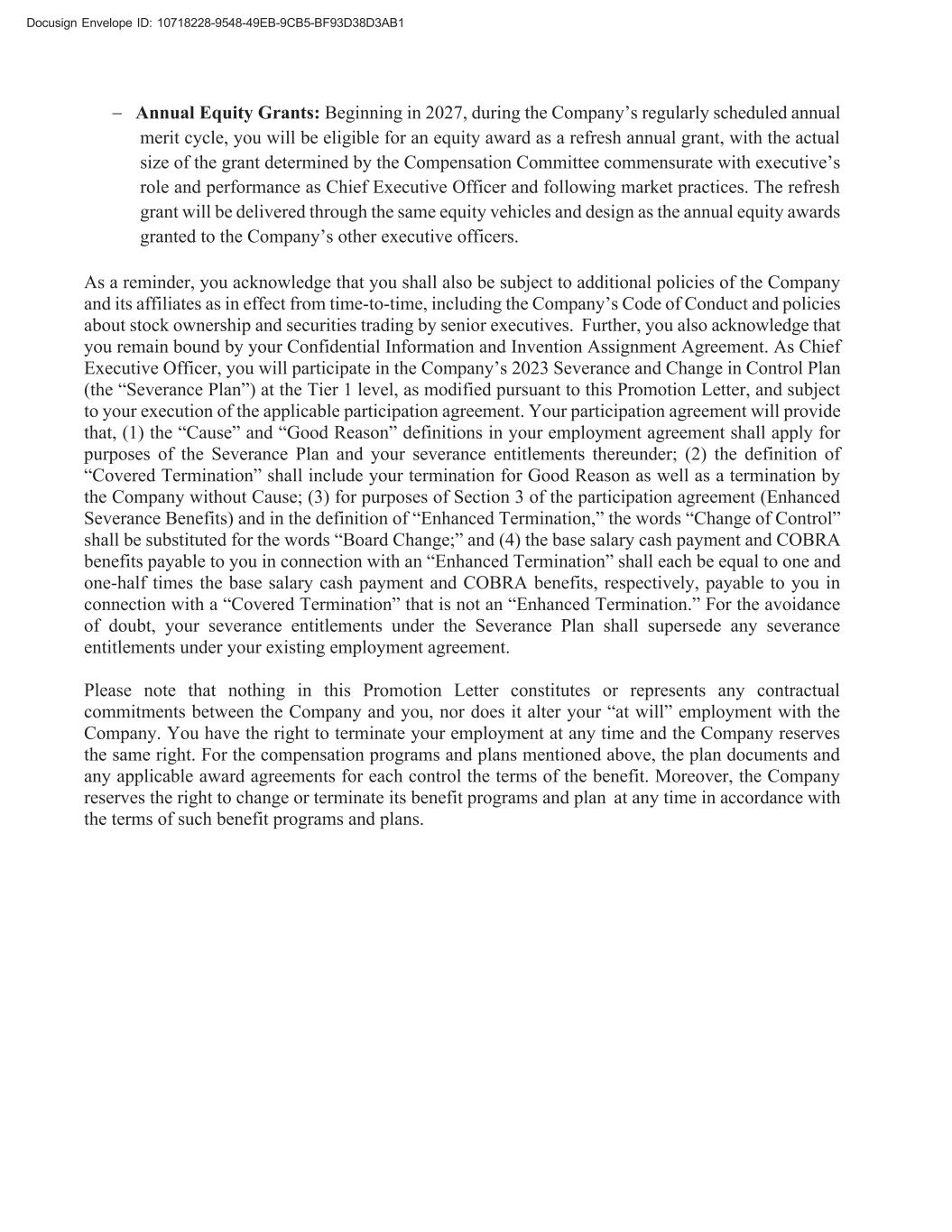 Docusign Envelope ID: 10718228-9548-49EB-9CB5-BF93D38D3AB1 − Annual Equity Grants: Beginning in 2027, during the Company’s regularly scheduled annual merit cycle, you will be eligible for an equity award as a refresh annual grant, with the actual size of the grant determined by the Compensation Committee commensurate with executive’s role and performance as Chief Executive Officer and following market practices. The refresh grant will be delivered through the same equity vehicles and design as the annual equity awards granted to the Company’s other executive officers. As a reminder, you acknowledge that you shall also be subject to additional policies of the Company and its affiliates as in effect from time-to-time, including the Company’s Code of Conduct and policies about stock ownership and securities trading by senior executives. Further, you also acknowledge that you remain bound by your Confidential Information and Invention Assignment Agreement. As Chief Executive Officer, you will participate in the Company’s 2023 Severance and Change in Control Plan (the “Severance Plan”) at the Tier 1 level, as modified pursuant to this Promotion Letter, and subject to your execution of the applicable participation agreement. Your participation agreement will provide that, (1) the “Cause” and “Good Reason” definitions in your employment agreement shall apply for purposes of the Severance Plan and your severance entitlements thereunder; (2) the definition of “Covered Termination” shall include your termination for Good Reason as well as a termination by the Company without Cause; (3) for purposes of Section 3 of the participation agreement (Enhanced Severance Benefits) and in the definition of “Enhanced Termination,” the words “Change of Control” shall be substituted for the words “Board Change;” and (4) the base salary cash payment and COBRA benefits payable to you in connection with an “Enhanced Termination” shall each be equal to one and one-half times the base salary cash payment and COBRA benefits, respectively, payable to you in connection with a “Covered Termination” that is not an “Enhanced Termination.” For the avoidance of doubt, your severance entitlements under the Severance Plan shall supersede any severance entitlements under your existing employment agreement. Please note that nothing in this Promotion Letter constitutes or represents any contractual commitments between the Company and you, nor does it alter your “at will” employment with the Company. You have the right to terminate your employment at any time and the Company reserves the same right. For the compensation programs and plans mentioned above, the plan documents and any applicable award agreements for each control the terms of the benefit. Moreover, the Company reserves the right to change or terminate its benefit programs and plan at any time in accordance with the terms of such benefit programs and plans.