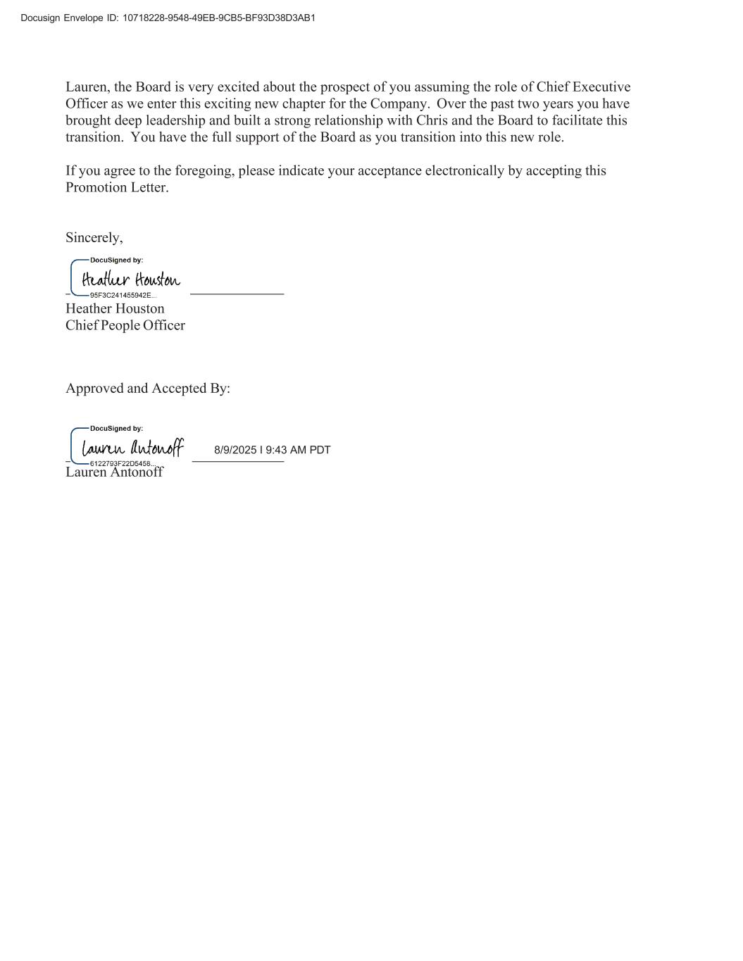 Docusign Envelope ID: 10718228-9548-49EB-9CB5-BF93D38D3AB1 Lauren, the Board is very excited about the prospect of you assuming the role of Chief Executive Officer as we enter this exciting new chapter for the Company. Over the past two years you have brought deep leadership and built a strong relationship with Chris and the Board to facilitate this transition. You have the full support of the Board as you transition into this new role. If you agree to the foregoing, please indicate your acceptance electronically by accepting this Promotion Letter. Sincerely, Heather Houston Chief People Officer Approved and Accepted By: 8/9/2025 I 9:43 AM PDT Lauren Antonoff