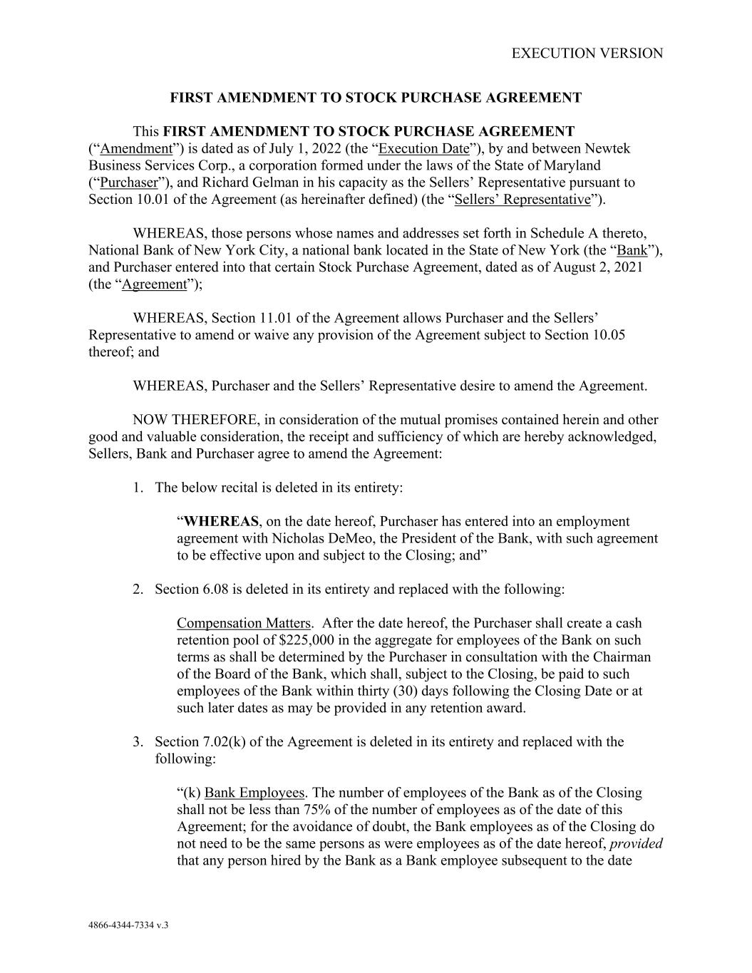 EXECUTION VERSION 4866-4344-7334 v.3 FIRST AMENDMENT TO STOCK PURCHASE AGREEMENT This FIRST AMENDMENT TO STOCK PURCHASE AGREEMENT (“Amendment”) is dated as of July 1, 2022 (the “Execution Date”), by and between Newtek Business Services Corp., a corporation formed under the laws of the State of Maryland (“Purchaser”), and Richard Gelman in his capacity as the Sellers’ Representative pursuant to Section 10.01 of the Agreement (as hereinafter defined) (the “Sellers’ Representative”). WHEREAS, those persons whose names and addresses set forth in Schedule A thereto, National Bank of New York City, a national bank located in the State of New York (the “Bank”), and Purchaser entered into that certain Stock Purchase Agreement, dated as of August 2, 2021 (the “Agreement”); WHEREAS, Section 11.01 of the Agreement allows Purchaser and the Sellers’ Representative to amend or waive any provision of the Agreement subject to Section 10.05 thereof; and WHEREAS, Purchaser and the Sellers’ Representative desire to amend the Agreement. NOW THEREFORE, in consideration of the mutual promises contained herein and other good and valuable consideration, the receipt and sufficiency of which are hereby acknowledged, Sellers, Bank and Purchaser agree to amend the Agreement: 1. The below recital is deleted in its entirety: “WHEREAS, on the date hereof, Purchaser has entered into an employment agreement with Nicholas DeMeo, the President of the Bank, with such agreement to be effective upon and subject to the Closing; and” 2. Section 6.08 is deleted in its entirety and replaced with the following: Compensation Matters. After the date hereof, the Purchaser shall create a cash retention pool of $225,000 in the aggregate for employees of the Bank on such terms as shall be determined by the Purchaser in consultation with the Chairman of the Board of the Bank, which shall, subject to the Closing, be paid to such employees of the Bank within thirty (30) days following the Closing Date or at such later dates as may be provided in any retention award. 3. Section 7.02(k) of the Agreement is deleted in its entirety and replaced with the following: “(k) Bank Employees. The number of employees of the Bank as of the Closing shall not be less than 75% of the number of employees as of the date of this Agreement; for the avoidance of doubt, the Bank employees as of the Closing do not need to be the same persons as were employees as of the date hereof, provided that any person hired by the Bank as a Bank employee subsequent to the date