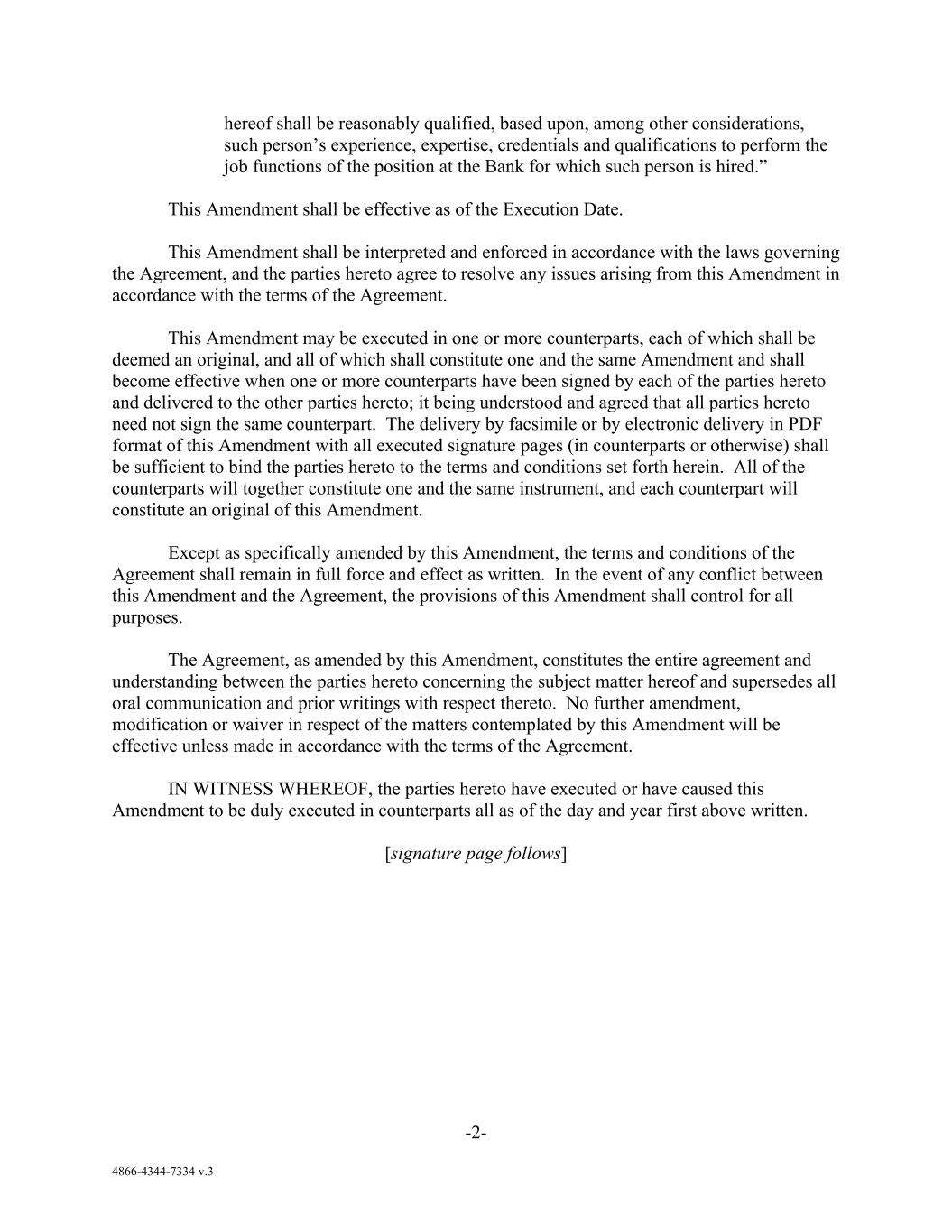 -2- 4866-4344-7334 v.3 hereof shall be reasonably qualified, based upon, among other considerations, such person’s experience, expertise, credentials and qualifications to perform the job functions of the position at the Bank for which such person is hired.” This Amendment shall be effective as of the Execution Date. This Amendment shall be interpreted and enforced in accordance with the laws governing the Agreement, and the parties hereto agree to resolve any issues arising from this Amendment in accordance with the terms of the Agreement. This Amendment may be executed in one or more counterparts, each of which shall be deemed an original, and all of which shall constitute one and the same Amendment and shall become effective when one or more counterparts have been signed by each of the parties hereto and delivered to the other parties hereto; it being understood and agreed that all parties hereto need not sign the same counterpart. The delivery by facsimile or by electronic delivery in PDF format of this Amendment with all executed signature pages (in counterparts or otherwise) shall be sufficient to bind the parties hereto to the terms and conditions set forth herein. All of the counterparts will together constitute one and the same instrument, and each counterpart will constitute an original of this Amendment. Except as specifically amended by this Amendment, the terms and conditions of the Agreement shall remain in full force and effect as written. In the event of any conflict between this Amendment and the Agreement, the provisions of this Amendment shall control for all purposes. The Agreement, as amended by this Amendment, constitutes the entire agreement and understanding between the parties hereto concerning the subject matter hereof and supersedes all oral communication and prior writings with respect thereto. No further amendment, modification or waiver in respect of the matters contemplated by this Amendment will be effective unless made in accordance with the terms of the Agreement. IN WITNESS WHEREOF, the parties hereto have executed or have caused this Amendment to be duly executed in counterparts all as of the day and year first above written. [signature page follows]