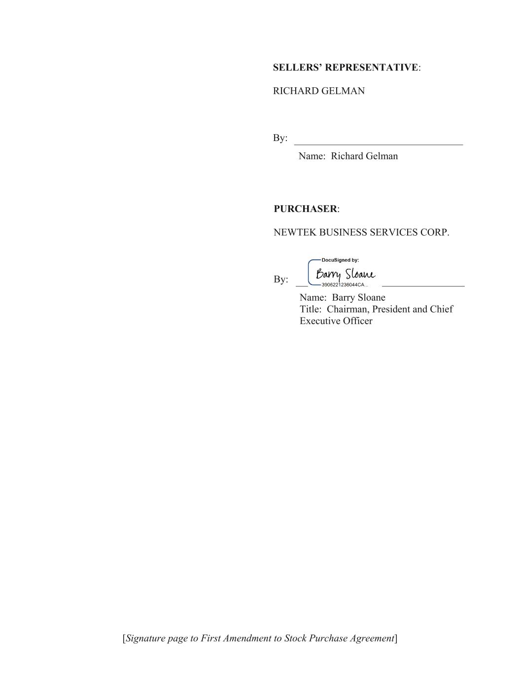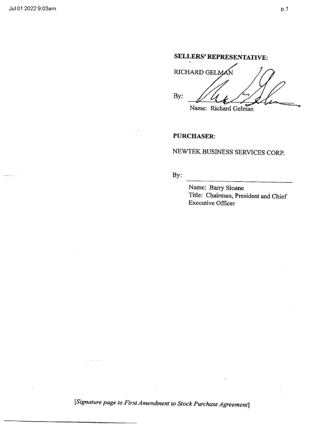 [Signature page to First Amendment to Stock Purchase Agreement] SELLERS’ REPRESENTATIVE: RICHARD GELMAN By: Name: Richard Gelman PURCHASER: NEWTEK BUSINESS SERVICES CORP. By: Name: Barry Sloane Title: Chairman, President and Chief Executive Officer