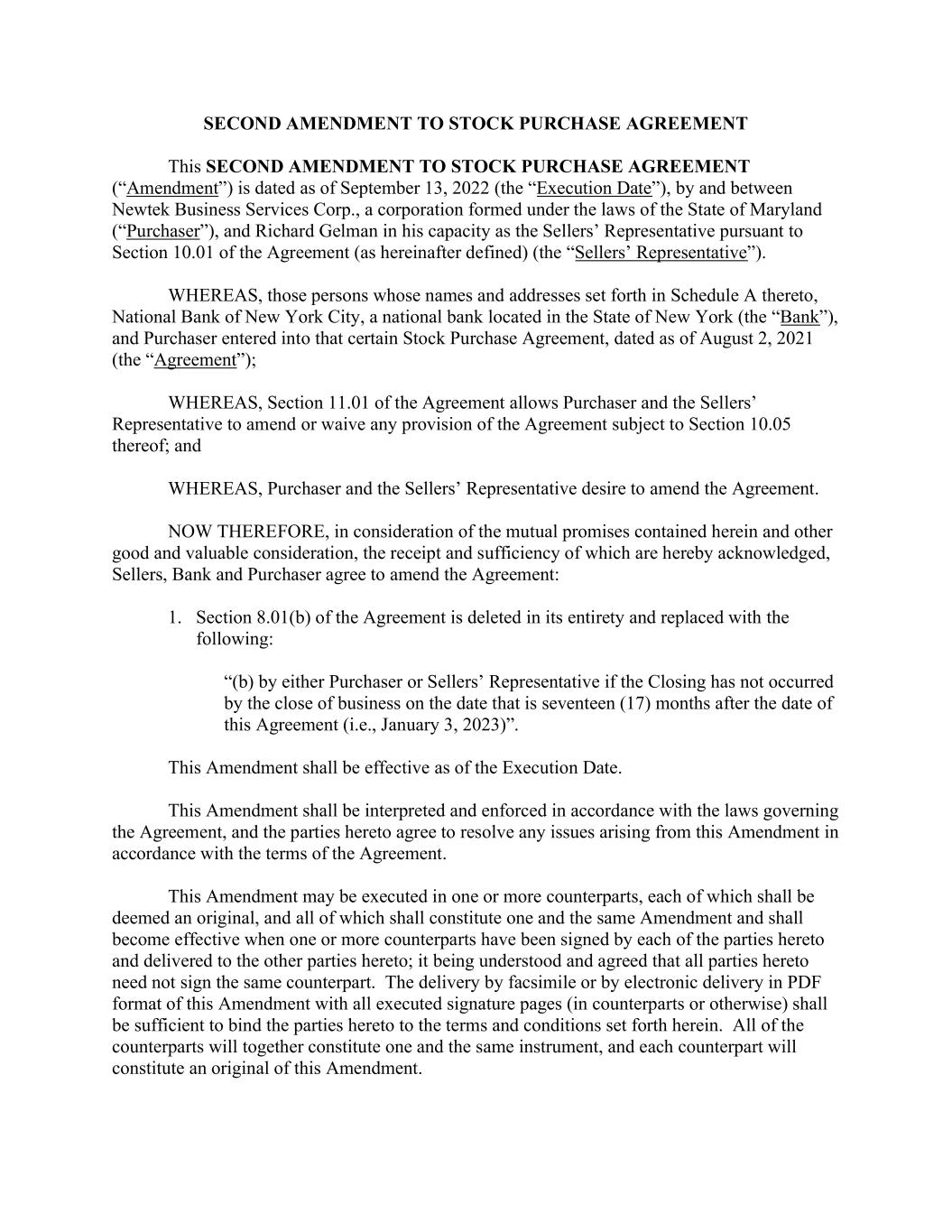 SECOND AMENDMENT TO STOCK PURCHASE AGREEMENT This SECOND AMENDMENT TO STOCK PURCHASE AGREEMENT (“Amendment”) is dated as of September 13, 2022 (the “Execution Date”), by and between Newtek Business Services Corp., a corporation formed under the laws of the State of Maryland (“Purchaser”), and Richard Gelman in his capacity as the Sellers’ Representative pursuant to Section 10.01 of the Agreement (as hereinafter defined) (the “Sellers’ Representative”). WHEREAS, those persons whose names and addresses set forth in Schedule A thereto, National Bank of New York City, a national bank located in the State of New York (the “Bank”), and Purchaser entered into that certain Stock Purchase Agreement, dated as of August 2, 2021 (the “Agreement”); WHEREAS, Section 11.01 of the Agreement allows Purchaser and the Sellers’ Representative to amend or waive any provision of the Agreement subject to Section 10.05 thereof; and WHEREAS, Purchaser and the Sellers’ Representative desire to amend the Agreement. NOW THEREFORE, in consideration of the mutual promises contained herein and other good and valuable consideration, the receipt and sufficiency of which are hereby acknowledged, Sellers, Bank and Purchaser agree to amend the Agreement: 1. Section 8.01(b) of the Agreement is deleted in its entirety and replaced with the following: “(b) by either Purchaser or Sellers’ Representative if the Closing has not occurred by the close of business on the date that is seventeen (17) months after the date of this Agreement (i.e., January 3, 2023)”. This Amendment shall be effective as of the Execution Date. This Amendment shall be interpreted and enforced in accordance with the laws governing the Agreement, and the parties hereto agree to resolve any issues arising from this Amendment in accordance with the terms of the Agreement. This Amendment may be executed in one or more counterparts, each of which shall be deemed an original, and all of which shall constitute one and the same Amendment and shall become effective when one or more counterparts have been signed by each of the parties hereto and delivered to the other parties hereto; it being understood and agreed that all parties hereto need not sign the same counterpart. The delivery by facsimile or by electronic delivery in PDF format of this Amendment with all executed signature pages (in counterparts or otherwise) shall be sufficient to bind the parties hereto to the terms and conditions set forth herein. All of the counterparts will together constitute one and the same instrument, and each counterpart will constitute an original of this Amendment.