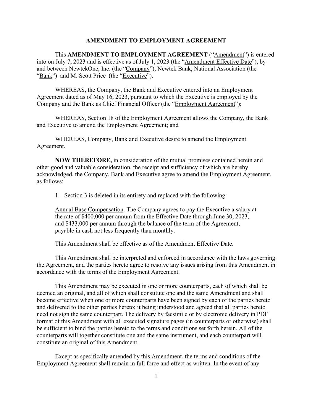 1 AMENDMENT TO EMPLOYMENT AGREEMENT This AMENDMENT TO EMPLOYMENT AGREEMENT (“Amendment”) is entered into on July 7, 2023 and is effective as of July 1, 2023 (the “Amendment Effective Date”), by and between NewtekOne, Inc. (the “Company”), Newtek Bank, National Association (the “Bank”) and M. Scott Price (the “Executive”). WHEREAS, the Company, the Bank and Executive entered into an Employment Agreement dated as of May 16, 2023, pursuant to which the Executive is employed by the Company and the Bank as Chief Financial Officer (the “Employment Agreement”); WHEREAS, Section 18 of the Employment Agreement allows the Company, the Bank and Executive to amend the Employment Agreement; and WHEREAS, Company, Bank and Executive desire to amend the Employment Agreement. NOW THEREFORE, in consideration of the mutual promises contained herein and other good and valuable consideration, the receipt and sufficiency of which are hereby acknowledged, the Company, Bank and Executive agree to amend the Employment Agreement, as follows: 1. Section 3 is deleted in its entirety and replaced with the following: Annual Base Compensation. The Company agrees to pay the Executive a salary at the rate of $400,000 per annum from the Effective Date through June 30, 2023, and $433,000 per annum through the balance of the term of the Agreement, payable in cash not less frequently than monthly. This Amendment shall be effective as of the Amendment Effective Date. This Amendment shall be interpreted and enforced in accordance with the laws governing the Agreement, and the parties hereto agree to resolve any issues arising from this Amendment in accordance with the terms of the Employment Agreement. This Amendment may be executed in one or more counterparts, each of which shall be deemed an original, and all of which shall constitute one and the same Amendment and shall become effective when one or more counterparts have been signed by each of the parties hereto and delivered to the other parties hereto; it being understood and agreed that all parties hereto need not sign the same counterpart. The delivery by facsimile or by electronic delivery in PDF format of this Amendment with all executed signature pages (in counterparts or otherwise) shall be sufficient to bind the parties hereto to the terms and conditions set forth herein. All of the counterparts will together constitute one and the same instrument, and each counterpart will constitute an original of this Amendment. Except as specifically amended by this Amendment, the terms and conditions of the Employment Agreement shall remain in full force and effect as written. In the event of any