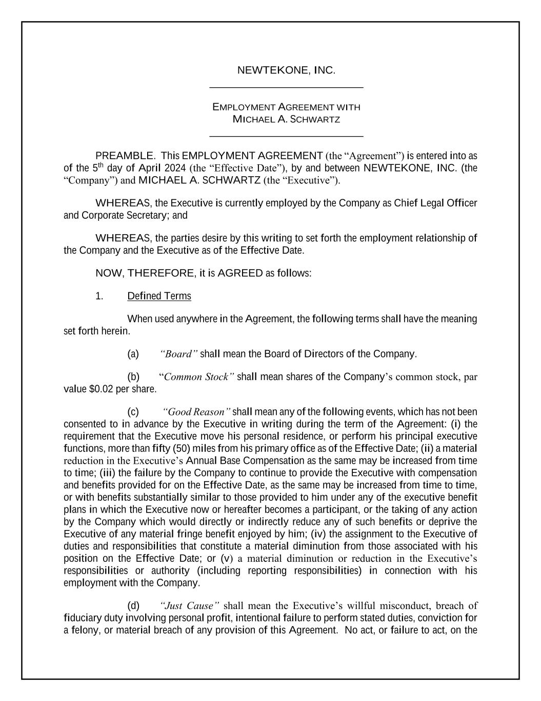 NEWTEKONE, INC. _____________________________ EMPLOYMENT AGREEMENT WITH MICHAEL A. SCHWARTZ _____________________________ PREAMBLE. This EMPLOYMENT AGREEMENT (the “Agreement”) is entered into as of the 5th day of April 2024 (the “Effective Date”), by and between NEWTEKONE, INC. (the “Company”) and MICHAEL A. SCHWARTZ (the “Executive”). WHEREAS, the Executive is currently employed by the Company as Chief Legal Officer and Corporate Secretary; and WHEREAS, the parties desire by this writing to set forth the employment relationship of the Company and the Executive as of the Effective Date. NOW, THEREFORE, it is AGREED as follows: 1. Defined Terms When used anywhere in the Agreement, the following terms shall have the meaning set forth herein. (a) “Board” shall mean the Board of Directors of the Company. (b) “Common Stock” shall mean shares of the Company’s common stock, par value $0.02 per share. (c) “Good Reason” shall mean any of the following events, which has not been consented to in advance by the Executive in writing during the term of the Agreement: (i) the requirement that the Executive move his personal residence, or perform his principal executive functions, more than fifty (50) miles from his primary office as of the Effective Date; (ii) a material reduction in the Executive’s Annual Base Compensation as the same may be increased from time to time; (iii) the failure by the Company to continue to provide the Executive with compensation and benefits provided for on the Effective Date, as the same may be increased from time to time, or with benefits substantially similar to those provided to him under any of the executive benefit plans in which the Executive now or hereafter becomes a participant, or the taking of any action by the Company which would directly or indirectly reduce any of such benefits or deprive the Executive of any material fringe benefit enjoyed by him; (iv) the assignment to the Executive of duties and responsibilities that constitute a material diminution from those associated with his position on the Effective Date; or (v) a material diminution or reduction in the Executive’s responsibilities or authority (including reporting responsibilities) in connection with his employment with the Company. (d) “Just Cause” shall mean the Executive’s willful misconduct, breach of fiduciary duty involving personal profit, intentional failure to perform stated duties, conviction for a felony, or material breach of any provision of this Agreement. No act, or failure to act, on the