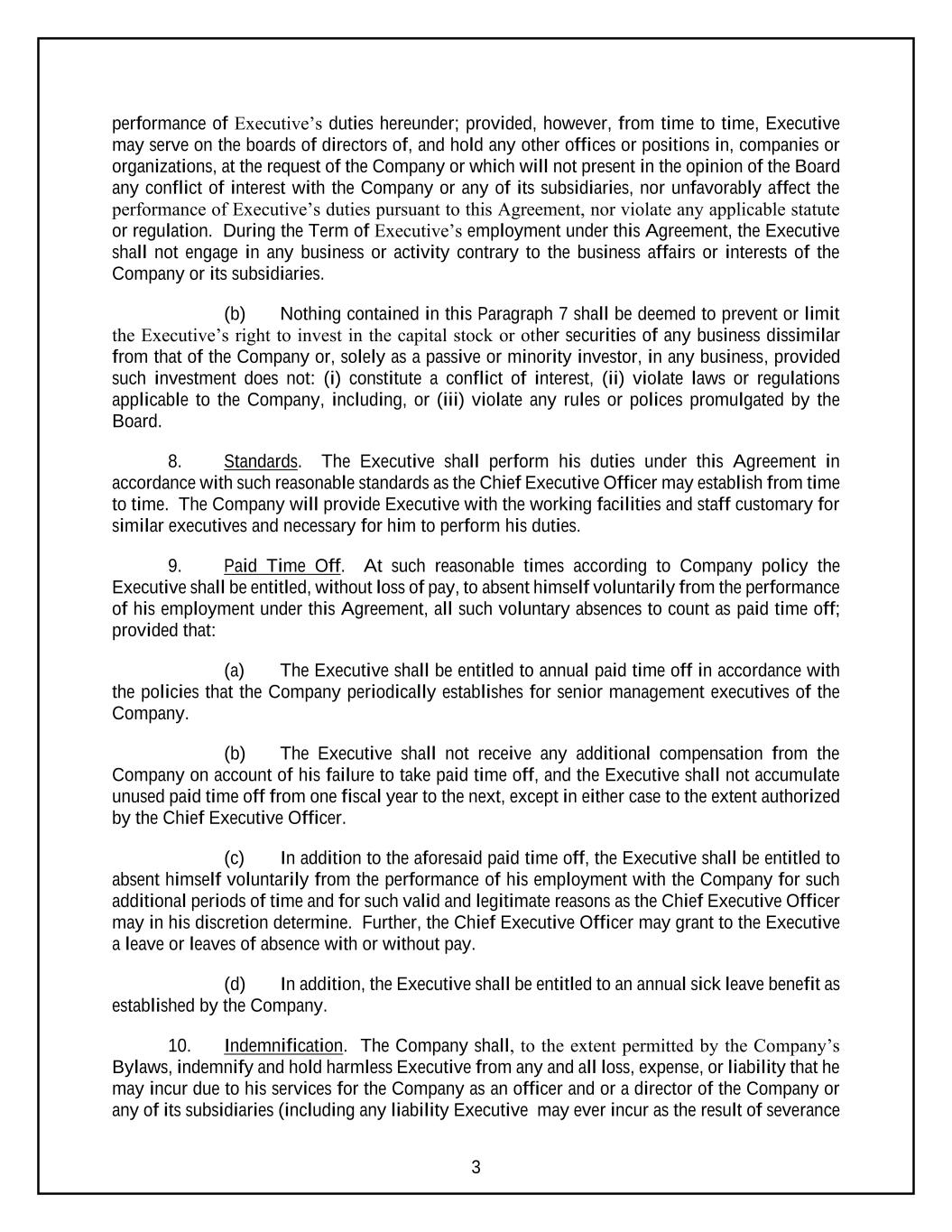 3 performance of Executive’s duties hereunder; provided, however, from time to time, Executive may serve on the boards of directors of, and hold any other offices or positions in, companies or organizations, at the request of the Company or which will not present in the opinion of the Board any conflict of interest with the Company or any of its subsidiaries, nor unfavorably affect the performance of Executive’s duties pursuant to this Agreement, nor violate any applicable statute or regulation. During the Term of Executive’s employment under this Agreement, the Executive shall not engage in any business or activity contrary to the business affairs or interests of the Company or its subsidiaries. (b) Nothing contained in this Paragraph 7 shall be deemed to prevent or limit the Executive’s right to invest in the capital stock or other securities of any business dissimilar from that of the Company or, solely as a passive or minority investor, in any business, provided such investment does not: (i) constitute a conflict of interest, (ii) violate laws or regulations applicable to the Company, including, or (iii) violate any rules or polices promulgated by the Board. 8. Standards. The Executive shall perform his duties under this Agreement in accordance with such reasonable standards as the Chief Executive Officer may establish from time to time. The Company will provide Executive with the working facilities and staff customary for similar executives and necessary for him to perform his duties. 9. Paid Time Off. At such reasonable times according to Company policy the Executive shall be entitled, without loss of pay, to absent himself voluntarily from the performance of his employment under this Agreement, all such voluntary absences to count as paid time off; provided that: (a) The Executive shall be entitled to annual paid time off in accordance with the policies that the Company periodically establishes for senior management executives of the Company. (b) The Executive shall not receive any additional compensation from the Company on account of his failure to take paid time off, and the Executive shall not accumulate unused paid time off from one fiscal year to the next, except in either case to the extent authorized by the Chief Executive Officer. (c) In addition to the aforesaid paid time off, the Executive shall be entitled to absent himself voluntarily from the performance of his employment with the Company for such additional periods of time and for such valid and legitimate reasons as the Chief Executive Officer may in his discretion determine. Further, the Chief Executive Officer may grant to the Executive a leave or leaves of absence with or without pay. (d) In addition, the Executive shall be entitled to an annual sick leave benefit as established by the Company. 10. Indemnification. The Company shall, to the extent permitted by the Company’s Bylaws, indemnify and hold harmless Executive from any and all loss, expense, or liability that he may incur due to his services for the Company as an officer and or a director of the Company or any of its subsidiaries (including any liability Executive may ever incur as the result of severance