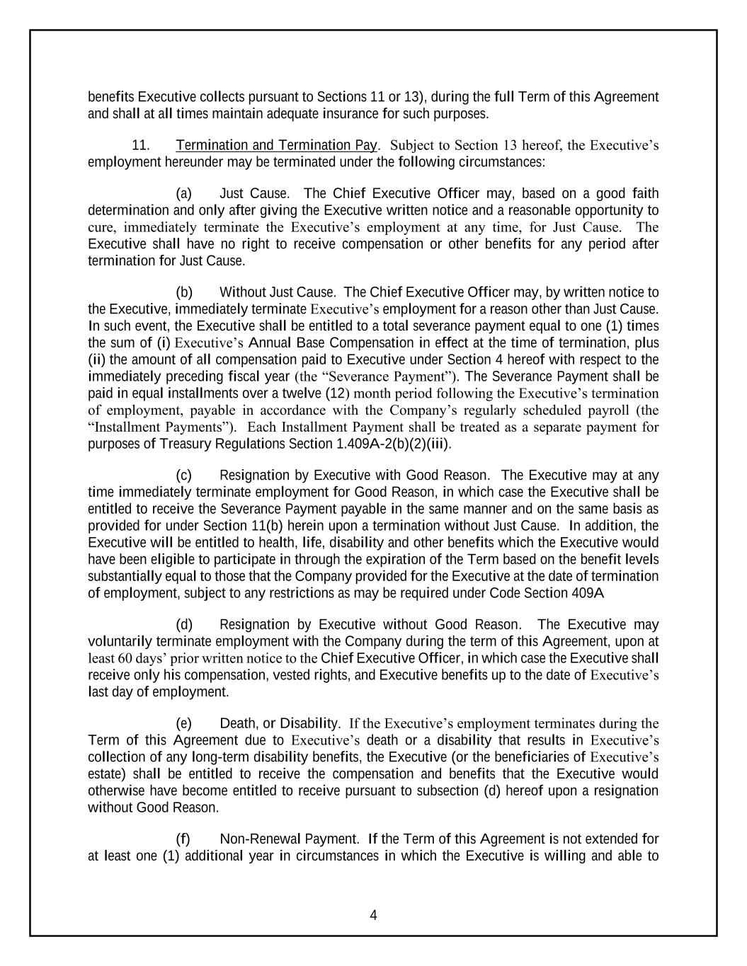 4 benefits Executive collects pursuant to Sections 11 or 13), during the full Term of this Agreement and shall at all times maintain adequate insurance for such purposes. 11. Termination and Termination Pay. Subject to Section 13 hereof, the Executive’s employment hereunder may be terminated under the following circumstances: (a) Just Cause. The Chief Executive Officer may, based on a good faith determination and only after giving the Executive written notice and a reasonable opportunity to cure, immediately terminate the Executive’s employment at any time, for Just Cause. The Executive shall have no right to receive compensation or other benefits for any period after termination for Just Cause. (b) Without Just Cause. The Chief Executive Officer may, by written notice to the Executive, immediately terminate Executive’s employment for a reason other than Just Cause. In such event, the Executive shall be entitled to a total severance payment equal to one (1) times the sum of (i) Executive’s Annual Base Compensation in effect at the time of termination, plus (ii) the amount of all compensation paid to Executive under Section 4 hereof with respect to the immediately preceding fiscal year (the “Severance Payment”). The Severance Payment shall be paid in equal installments over a twelve (12) month period following the Executive’s termination of employment, payable in accordance with the Company’s regularly scheduled payroll (the “Installment Payments”). Each Installment Payment shall be treated as a separate payment for purposes of Treasury Regulations Section 1.409A-2(b)(2)(iii). (c) Resignation by Executive with Good Reason. The Executive may at any time immediately terminate employment for Good Reason, in which case the Executive shall be entitled to receive the Severance Payment payable in the same manner and on the same basis as provided for under Section 11(b) herein upon a termination without Just Cause. In addition, the Executive will be entitled to health, life, disability and other benefits which the Executive would have been eligible to participate in through the expiration of the Term based on the benefit levels substantially equal to those that the Company provided for the Executive at the date of termination of employment, subject to any restrictions as may be required under Code Section 409A (d) Resignation by Executive without Good Reason. The Executive may voluntarily terminate employment with the Company during the term of this Agreement, upon at least 60 days’ prior written notice to the Chief Executive Officer, in which case the Executive shall receive only his compensation, vested rights, and Executive benefits up to the date of Executive’s last day of employment. (e) Death, or Disability. If the Executive’s employment terminates during the Term of this Agreement due to Executive’s death or a disability that results in Executive’s collection of any long-term disability benefits, the Executive (or the beneficiaries of Executive’s estate) shall be entitled to receive the compensation and benefits that the Executive would otherwise have become entitled to receive pursuant to subsection (d) hereof upon a resignation without Good Reason. (f) Non-Renewal Payment. If the Term of this Agreement is not extended for at least one (1) additional year in circumstances in which the Executive is willing and able to