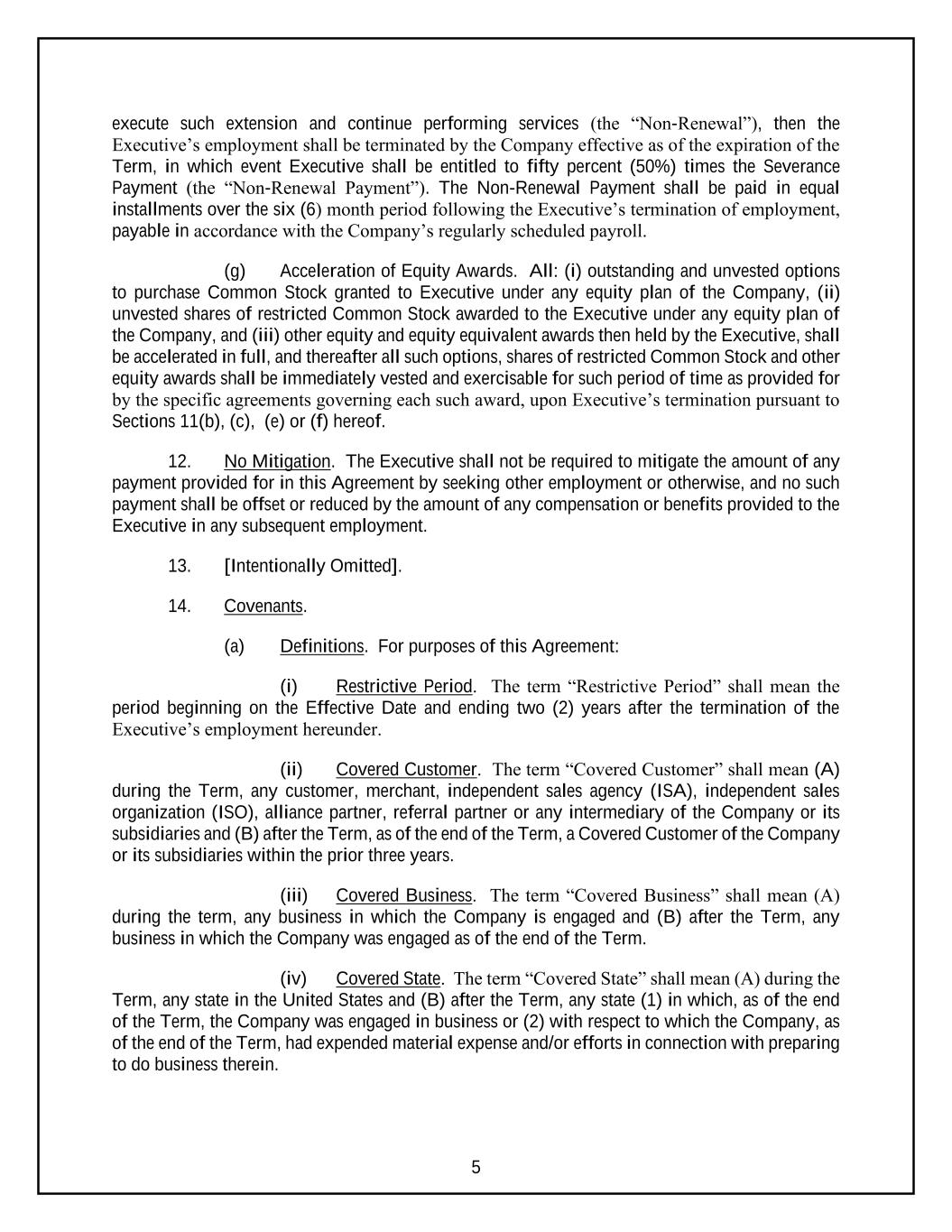 5 execute such extension and continue performing services (the “Non-Renewal”), then the Executive’s employment shall be terminated by the Company effective as of the expiration of the Term, in which event Executive shall be entitled to fifty percent (50%) times the Severance Payment (the “Non-Renewal Payment”). The Non-Renewal Payment shall be paid in equal installments over the six (6) month period following the Executive’s termination of employment, payable in accordance with the Company’s regularly scheduled payroll. (g) Acceleration of Equity Awards. All: (i) outstanding and unvested options to purchase Common Stock granted to Executive under any equity plan of the Company, (ii) unvested shares of restricted Common Stock awarded to the Executive under any equity plan of the Company, and (iii) other equity and equity equivalent awards then held by the Executive, shall be accelerated in full, and thereafter all such options, shares of restricted Common Stock and other equity awards shall be immediately vested and exercisable for such period of time as provided for by the specific agreements governing each such award, upon Executive’s termination pursuant to Sections 11(b), (c), (e) or (f) hereof. 12. No Mitigation. The Executive shall not be required to mitigate the amount of any payment provided for in this Agreement by seeking other employment or otherwise, and no such payment shall be offset or reduced by the amount of any compensation or benefits provided to the Executive in any subsequent employment. 13. [Intentionally Omitted]. 14. Covenants. (a) Definitions. For purposes of this Agreement: (i) Restrictive Period. The term “Restrictive Period” shall mean the period beginning on the Effective Date and ending two (2) years after the termination of the Executive’s employment hereunder. (ii) Covered Customer. The term “Covered Customer” shall mean (A) during the Term, any customer, merchant, independent sales agency (ISA), independent sales organization (ISO), alliance partner, referral partner or any intermediary of the Company or its subsidiaries and (B) after the Term, as of the end of the Term, a Covered Customer of the Company or its subsidiaries within the prior three years. (iii) Covered Business. The term “Covered Business” shall mean (A) during the term, any business in which the Company is engaged and (B) after the Term, any business in which the Company was engaged as of the end of the Term. (iv) Covered State. The term “Covered State” shall mean (A) during the Term, any state in the United States and (B) after the Term, any state (1) in which, as of the end of the Term, the Company was engaged in business or (2) with respect to which the Company, as of the end of the Term, had expended material expense and/or efforts in connection with preparing to do business therein.