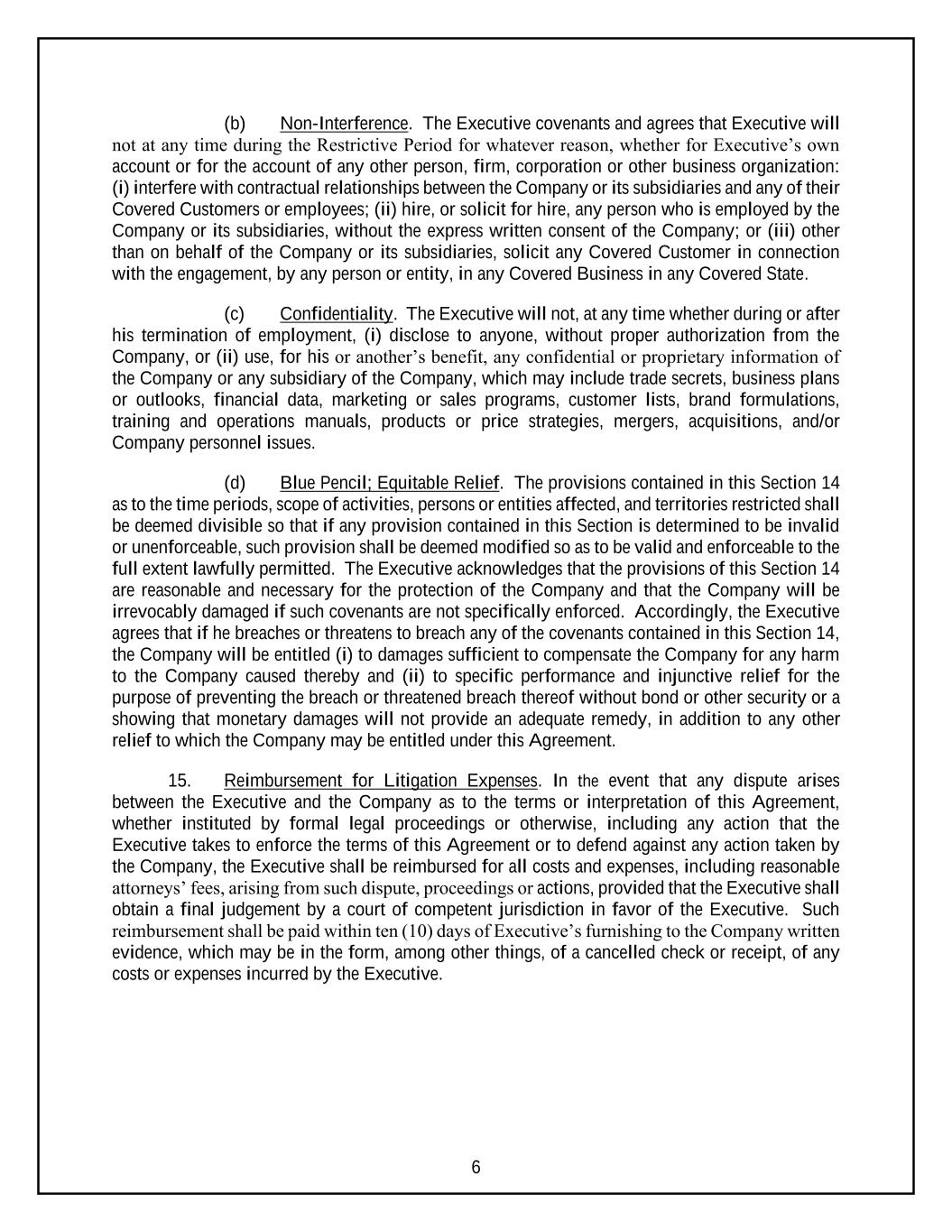6 (b) Non-Interference. The Executive covenants and agrees that Executive will not at any time during the Restrictive Period for whatever reason, whether for Executive’s own account or for the account of any other person, firm, corporation or other business organization: (i) interfere with contractual relationships between the Company or its subsidiaries and any of their Covered Customers or employees; (ii) hire, or solicit for hire, any person who is employed by the Company or its subsidiaries, without the express written consent of the Company; or (iii) other than on behalf of the Company or its subsidiaries, solicit any Covered Customer in connection with the engagement, by any person or entity, in any Covered Business in any Covered State. (c) Confidentiality. The Executive will not, at any time whether during or after his termination of employment, (i) disclose to anyone, without proper authorization from the Company, or (ii) use, for his or another’s benefit, any confidential or proprietary information of the Company or any subsidiary of the Company, which may include trade secrets, business plans or outlooks, financial data, marketing or sales programs, customer lists, brand formulations, training and operations manuals, products or price strategies, mergers, acquisitions, and/or Company personnel issues. (d) Blue Pencil; Equitable Relief. The provisions contained in this Section 14 as to the time periods, scope of activities, persons or entities affected, and territories restricted shall be deemed divisible so that if any provision contained in this Section is determined to be invalid or unenforceable, such provision shall be deemed modified so as to be valid and enforceable to the full extent lawfully permitted. The Executive acknowledges that the provisions of this Section 14 are reasonable and necessary for the protection of the Company and that the Company will be irrevocably damaged if such covenants are not specifically enforced. Accordingly, the Executive agrees that if he breaches or threatens to breach any of the covenants contained in this Section 14, the Company will be entitled (i) to damages sufficient to compensate the Company for any harm to the Company caused thereby and (ii) to specific performance and injunctive relief for the purpose of preventing the breach or threatened breach thereof without bond or other security or a showing that monetary damages will not provide an adequate remedy, in addition to any other relief to which the Company may be entitled under this Agreement. 15. Reimbursement for Litigation Expenses. In the event that any dispute arises between the Executive and the Company as to the terms or interpretation of this Agreement, whether instituted by formal legal proceedings or otherwise, including any action that the Executive takes to enforce the terms of this Agreement or to defend against any action taken by the Company, the Executive shall be reimbursed for all costs and expenses, including reasonable attorneys’ fees, arising from such dispute, proceedings or actions, provided that the Executive shall obtain a final judgement by a court of competent jurisdiction in favor of the Executive. Such reimbursement shall be paid within ten (10) days of Executive’s furnishing to the Company written evidence, which may be in the form, among other things, of a cancelled check or receipt, of any costs or expenses incurred by the Executive.