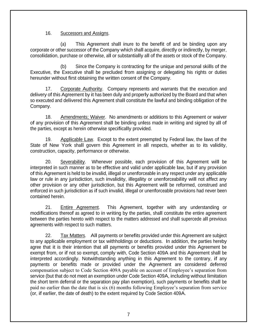 7 16. Successors and Assigns. (a) This Agreement shall inure to the benefit of and be binding upon any corporate or other successor of the Company which shall acquire, directly or indirectly, by merger, consolidation, purchase or otherwise, all or substantially all of the assets or stock of the Company. (b) Since the Company is contracting for the unique and personal skills of the Executive, the Executive shall be precluded from assigning or delegating his rights or duties hereunder without first obtaining the written consent of the Company. 17. Corporate Authority. Company represents and warrants that the execution and delivery of this Agreement by it has been duly and properly authorized by the Board and that when so executed and delivered this Agreement shall constitute the lawful and binding obligation of the Company. 18. Amendments; Waiver. No amendments or additions to this Agreement or waiver of any provision of this Agreement shall be binding unless made in writing and signed by all of the parties, except as herein otherwise specifically provided. 19. Applicable Law. Except to the extent preempted by Federal law, the laws of the State of New York shall govern this Agreement in all respects, whether as to its validity, construction, capacity, performance or otherwise. 20. Severability. Whenever possible, each provision of this Agreement will be interpreted in such manner as to be effective and valid under applicable law, but if any provision of this Agreement is held to be invalid, illegal or unenforceable in any respect under any applicable law or rule in any jurisdiction, such invalidity, illegality or unenforceability will not affect any other provision or any other jurisdiction, but this Agreement will be reformed, construed and enforced in such jurisdiction as if such invalid, illegal or unenforceable provisions had never been contained herein. 21. Entire Agreement. This Agreement, together with any understanding or modifications thereof as agreed to in writing by the parties, shall constitute the entire agreement between the parties hereto with respect to the matters addressed and shall supercede all previous agreements with respect to such matters. 22. Tax Matters. All payments or benefits provided under this Agreement are subject to any applicable employment or tax withholdings or deductions. In addition, the parties hereby agree that it is their intention that all payments or benefits provided under this Agreement be exempt from, or if not so exempt, comply with, Code Section 409A and this Agreement shall be interpreted accordingly. Notwithstanding anything in this Agreement to the contrary, if any payments or benefits made or provided under the Agreement are considered deferred compensation subject to Code Section 409A payable on account of Employee’s separation from service (but that do not meet an exemption under Code Section 409A, including without limitation the short term deferral or the separation pay plan exemption), such payments or benefits shall be paid no earlier than the date that is six (6) months following Employee’s separation from service (or, if earlier, the date of death) to the extent required by Code Section 409A.