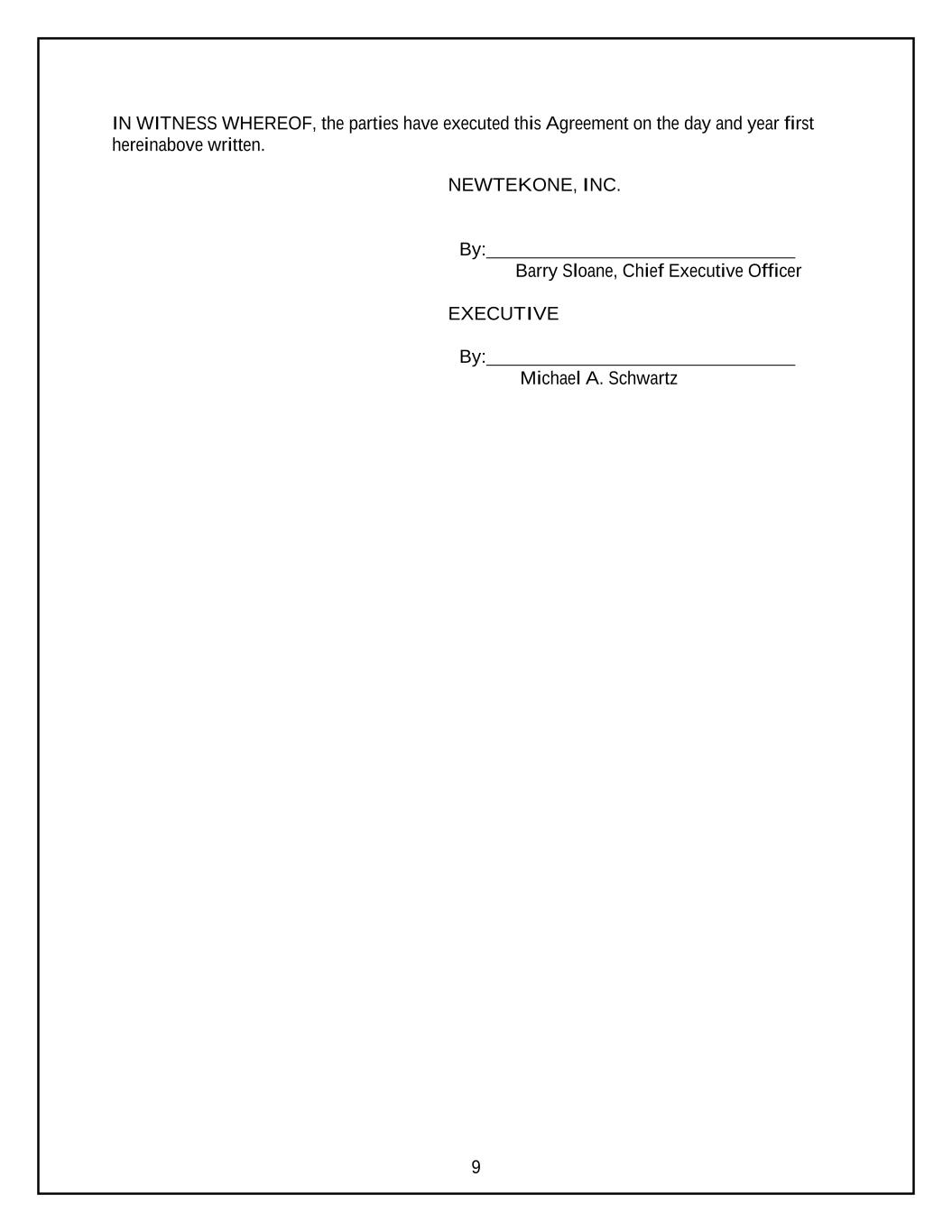 9 IN WITNESS WHEREOF, the parties have executed this Agreement on the day and year first hereinabove written. NEWTEKONE, INC. By: Barry Sloane, Chief Executive Officer EXECUTIVE By: Michael A. Schwartz