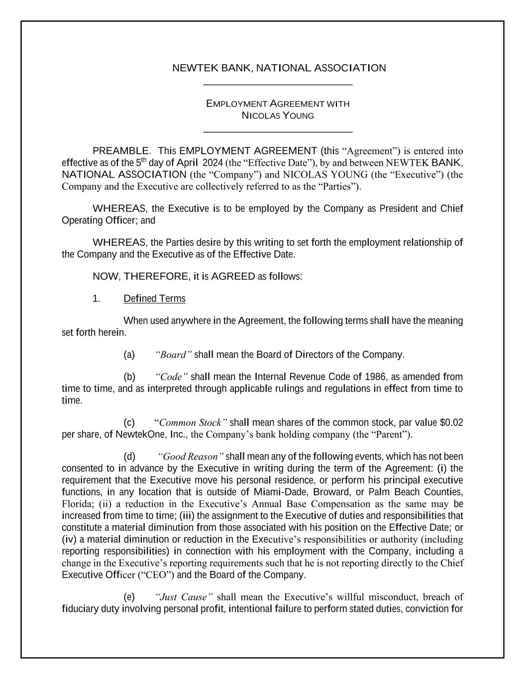 NEWTEK BANK, NATIONAL ASSOCIATION _____________________________ EMPLOYMENT AGREEMENT WITH NICOLAS YOUNG _____________________________ PREAMBLE. This EMPLOYMENT AGREEMENT (this “Agreement”) is entered into effective as of the 5th day of April 2024 (the “Effective Date”), by and between NEWTEK BANK, NATIONAL ASSOCIATION (the “Company”) and NICOLAS YOUNG (the “Executive”) (the Company and the Executive are collectively referred to as the “Parties”). WHEREAS, the Executive is to be employed by the Company as President and Chief Operating Officer; and WHEREAS, the Parties desire by this writing to set forth the employment relationship of the Company and the Executive as of the Effective Date. NOW, THEREFORE, it is AGREED as follows: 1. Defined Terms When used anywhere in the Agreement, the following terms shall have the meaning set forth herein. (a) “Board” shall mean the Board of Directors of the Company. (b) “Code” shall mean the Internal Revenue Code of 1986, as amended from time to time, and as interpreted through applicable rulings and regulations in effect from time to time. (c) “Common Stock” shall mean shares of the common stock, par value $0.02 per share, of NewtekOne, Inc., the Company’s bank holding company (the “Parent”). (d) “Good Reason” shall mean any of the following events, which has not been consented to in advance by the Executive in writing during the term of the Agreement: (i) the requirement that the Executive move his personal residence, or perform his principal executive functions, in any location that is outside of Miami-Dade, Broward, or Palm Beach Counties, Florida; (ii) a reduction in the Executive’s Annual Base Compensation as the same may be increased from time to time; (iii) the assignment to the Executive of duties and responsibilities that constitute a material diminution from those associated with his position on the Effective Date; or (iv) a material diminution or reduction in the Executive’s responsibilities or authority (including reporting responsibilities) in connection with his employment with the Company, including a change in the Executive’s reporting requirements such that he is not reporting directly to the Chief Executive Officer (“CEO”) and the Board of the Company. (e) “Just Cause” shall mean the Executive’s willful misconduct, breach of fiduciary duty involving personal profit, intentional failure to perform stated duties, conviction for