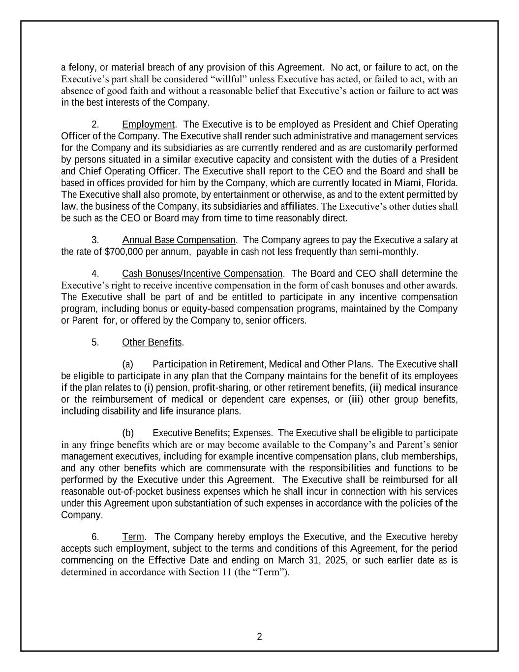 2 a felony, or material breach of any provision of this Agreement. No act, or failure to act, on the Executive’s part shall be considered “willful” unless Executive has acted, or failed to act, with an absence of good faith and without a reasonable belief that Executive’s action or failure to act was in the best interests of the Company. 2. Employment. The Executive is to be employed as President and Chief Operating Officer of the Company. The Executive shall render such administrative and management services for the Company and its subsidiaries as are currently rendered and as are customarily performed by persons situated in a similar executive capacity and consistent with the duties of a President and Chief Operating Officer. The Executive shall report to the CEO and the Board and shall be based in offices provided for him by the Company, which are currently located in Miami, Florida. The Executive shall also promote, by entertainment or otherwise, as and to the extent permitted by law, the business of the Company, its subsidiaries and affiliates. The Executive’s other duties shall be such as the CEO or Board may from time to time reasonably direct. 3. Annual Base Compensation. The Company agrees to pay the Executive a salary at the rate of $700,000 per annum, payable in cash not less frequently than semi-monthly. 4. Cash Bonuses/Incentive Compensation. The Board and CEO shall determine the Executive’s right to receive incentive compensation in the form of cash bonuses and other awards. The Executive shall be part of and be entitled to participate in any incentive compensation program, including bonus or equity-based compensation programs, maintained by the Company or Parent for, or offered by the Company to, senior officers. 5. Other Benefits. (a) Participation in Retirement, Medical and Other Plans. The Executive shall be eligible to participate in any plan that the Company maintains for the benefit of its employees if the plan relates to (i) pension, profit-sharing, or other retirement benefits, (ii) medical insurance or the reimbursement of medical or dependent care expenses, or (iii) other group benefits, including disability and life insurance plans. (b) Executive Benefits; Expenses. The Executive shall be eligible to participate in any fringe benefits which are or may become available to the Company’s and Parent’s senior management executives, including for example incentive compensation plans, club memberships, and any other benefits which are commensurate with the responsibilities and functions to be performed by the Executive under this Agreement. The Executive shall be reimbursed for all reasonable out-of-pocket business expenses which he shall incur in connection with his services under this Agreement upon substantiation of such expenses in accordance with the policies of the Company. 6. Term. The Company hereby employs the Executive, and the Executive hereby accepts such employment, subject to the terms and conditions of this Agreement, for the period commencing on the Effective Date and ending on March 31, 2025, or such earlier date as is determined in accordance with Section 11 (the “Term”).
