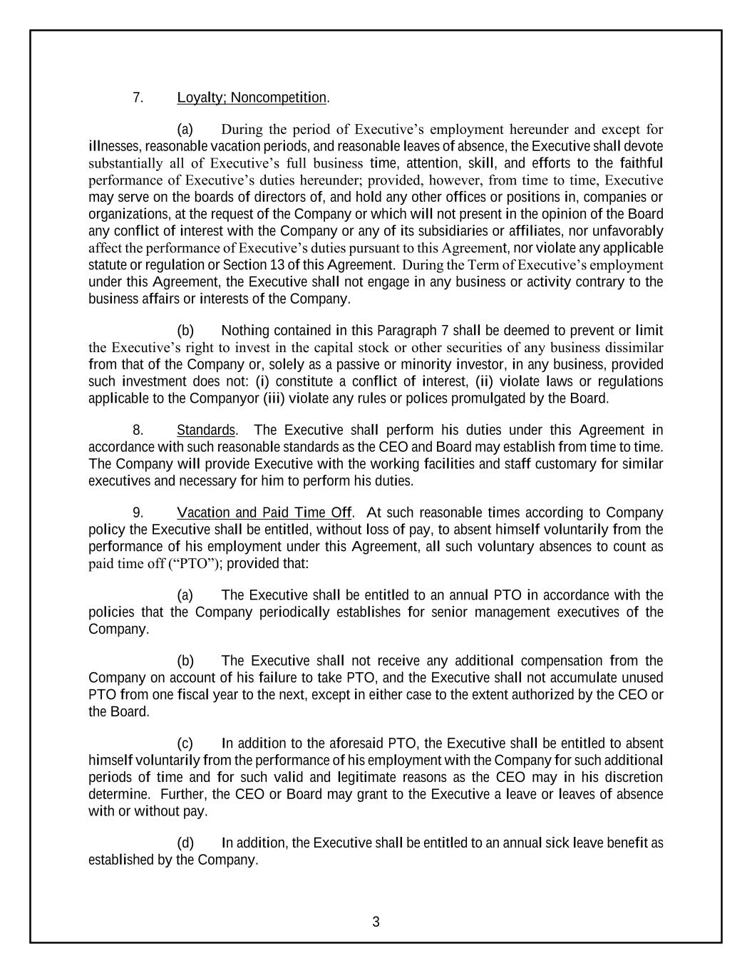 3 7. Loyalty; Noncompetition. (a) During the period of Executive’s employment hereunder and except for illnesses, reasonable vacation periods, and reasonable leaves of absence, the Executive shall devote substantially all of Executive’s full business time, attention, skill, and efforts to the faithful performance of Executive’s duties hereunder; provided, however, from time to time, Executive may serve on the boards of directors of, and hold any other offices or positions in, companies or organizations, at the request of the Company or which will not present in the opinion of the Board any conflict of interest with the Company or any of its subsidiaries or affiliates, nor unfavorably affect the performance of Executive’s duties pursuant to this Agreement, nor violate any applicable statute or regulation or Section 13 of this Agreement. During the Term of Executive’s employment under this Agreement, the Executive shall not engage in any business or activity contrary to the business affairs or interests of the Company. (b) Nothing contained in this Paragraph 7 shall be deemed to prevent or limit the Executive’s right to invest in the capital stock or other securities of any business dissimilar from that of the Company or, solely as a passive or minority investor, in any business, provided such investment does not: (i) constitute a conflict of interest, (ii) violate laws or regulations applicable to the Companyor (iii) violate any rules or polices promulgated by the Board. 8. Standards. The Executive shall perform his duties under this Agreement in accordance with such reasonable standards as the CEO and Board may establish from time to time. The Company will provide Executive with the working facilities and staff customary for similar executives and necessary for him to perform his duties. 9. Vacation and Paid Time Off. At such reasonable times according to Company policy the Executive shall be entitled, without loss of pay, to absent himself voluntarily from the performance of his employment under this Agreement, all such voluntary absences to count as paid time off (“PTO”); provided that: (a) The Executive shall be entitled to an annual PTO in accordance with the policies that the Company periodically establishes for senior management executives of the Company. (b) The Executive shall not receive any additional compensation from the Company on account of his failure to take PTO, and the Executive shall not accumulate unused PTO from one fiscal year to the next, except in either case to the extent authorized by the CEO or the Board. (c) In addition to the aforesaid PTO, the Executive shall be entitled to absent himself voluntarily from the performance of his employment with the Company for such additional periods of time and for such valid and legitimate reasons as the CEO may in his discretion determine. Further, the CEO or Board may grant to the Executive a leave or leaves of absence with or without pay. (d) In addition, the Executive shall be entitled to an annual sick leave benefit as established by the Company.