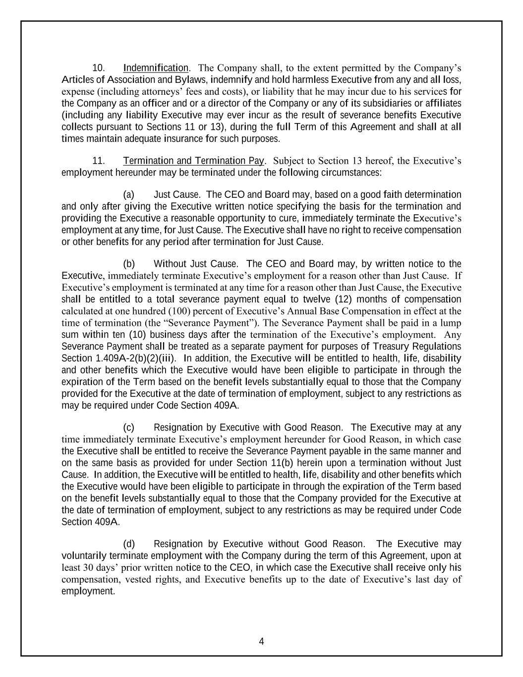 4 10. Indemnification. The Company shall, to the extent permitted by the Company’s Articles of Association and Bylaws, indemnify and hold harmless Executive from any and all loss, expense (including attorneys’ fees and costs), or liability that he may incur due to his services for the Company as an officer and or a director of the Company or any of its subsidiaries or affiliates (including any liability Executive may ever incur as the result of severance benefits Executive collects pursuant to Sections 11 or 13), during the full Term of this Agreement and shall at all times maintain adequate insurance for such purposes. 11. Termination and Termination Pay. Subject to Section 13 hereof, the Executive’s employment hereunder may be terminated under the following circumstances: (a) Just Cause. The CEO and Board may, based on a good faith determination and only after giving the Executive written notice specifying the basis for the termination and providing the Executive a reasonable opportunity to cure, immediately terminate the Executive’s employment at any time, for Just Cause. The Executive shall have no right to receive compensation or other benefits for any period after termination for Just Cause. (b) Without Just Cause. The CEO and Board may, by written notice to the Executive, immediately terminate Executive’s employment for a reason other than Just Cause. If Executive’s employment is terminated at any time for a reason other than Just Cause, the Executive shall be entitled to a total severance payment equal to twelve (12) months of compensation calculated at one hundred (100) percent of Executive’s Annual Base Compensation in effect at the time of termination (the “Severance Payment”). The Severance Payment shall be paid in a lump sum within ten (10) business days after the termination of the Executive’s employment. Any Severance Payment shall be treated as a separate payment for purposes of Treasury Regulations Section 1.409A-2(b)(2)(iii). In addition, the Executive will be entitled to health, life, disability and other benefits which the Executive would have been eligible to participate in through the expiration of the Term based on the benefit levels substantially equal to those that the Company provided for the Executive at the date of termination of employment, subject to any restrictions as may be required under Code Section 409A. (c) Resignation by Executive with Good Reason. The Executive may at any time immediately terminate Executive’s employment hereunder for Good Reason, in which case the Executive shall be entitled to receive the Severance Payment payable in the same manner and on the same basis as provided for under Section 11(b) herein upon a termination without Just Cause. In addition, the Executive will be entitled to health, life, disability and other benefits which the Executive would have been eligible to participate in through the expiration of the Term based on the benefit levels substantially equal to those that the Company provided for the Executive at the date of termination of employment, subject to any restrictions as may be required under Code Section 409A. (d) Resignation by Executive without Good Reason. The Executive may voluntarily terminate employment with the Company during the term of this Agreement, upon at least 30 days’ prior written notice to the CEO, in which case the Executive shall receive only his compensation, vested rights, and Executive benefits up to the date of Executive’s last day of employment.