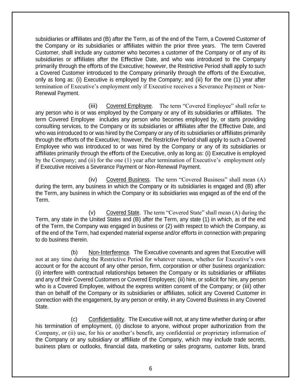 6 subsidiaries or affiliates and (B) after the Term, as of the end of the Term, a Covered Customer of the Company or its subsidiaries or affiliates within the prior three years. The term Covered Customer, shall include any customer who becomes a customer of the Company or of any of its subsidiaries or affiliates after the Effective Date, and who was introduced to the Company primarily through the efforts of the Executive; however, the Restrictive Period shall apply to such a Covered Customer introduced to the Company primarily through the efforts of the Executive, only as long as: (i) Executive is employed by the Company; and (ii) for the one (1) year after termination of Executive’s employment only if Executive receives a Severance Payment or Non- Renewal Payment. (iii) Covered Employee. The term “Covered Employee” shall refer to any person who is or was employed by the Company or any of its subsidiaries or affiliates. The term Covered Employee includes any person who becomes employed by, or starts providing consulting services, to the Company or its subsidiaries or affiliates after the Effective Date, and who was introduced to or was hired by the Company or any of its subsidiaries or affiliates primarily through the efforts of the Executive; however, the Restrictive Period shall apply to such a Covered Employee who was introduced to or was hired by the Company or any of its subsidiaries or affiliates primarily through the efforts of the Executive, only as long as: (i) Executive is employed by the Company; and (ii) for the one (1) year after termination of Executive’s employment only if Executive receives a Severance Payment or Non-Renewal Payment. (iv) Covered Business. The term “Covered Business” shall mean (A) during the term, any business in which the Company or its subsidiaries is engaged and (B) after the Term, any business in which the Company or its subsidiaries was engaged as of the end of the Term. (v) Covered State. The term “Covered State” shall mean (A) during the Term, any state in the United States and (B) after the Term, any state (1) in which, as of the end of the Term, the Company was engaged in business or (2) with respect to which the Company, as of the end of the Term, had expended material expense and/or efforts in connection with preparing to do business therein. (b) Non-Interference. The Executive covenants and agrees that Executive will not at any time during the Restrictive Period for whatever reason, whether for Executive’s own account or for the account of any other person, firm, corporation or other business organization: (i) interfere with contractual relationships between the Company or its subsidiaries or affiliates and any of their Covered Customers or Covered Employees; (ii) hire, or solicit for hire, any person who is a Covered Employee, without the express written consent of the Company; or (iii) other than on behalf of the Company or its subsidiaries or affiliates, solicit any Covered Customer in connection with the engagement, by any person or entity, in any Covered Business in any Covered State. (c) Confidentiality. The Executive will not, at any time whether during or after his termination of employment, (i) disclose to anyone, without proper authorization from the Company, or (ii) use, for his or another’s benefit, any confidential or proprietary information of the Company or any subsidiary or affiliate of the Company, which may include trade secrets, business plans or outlooks, financial data, marketing or sales programs, customer lists, brand