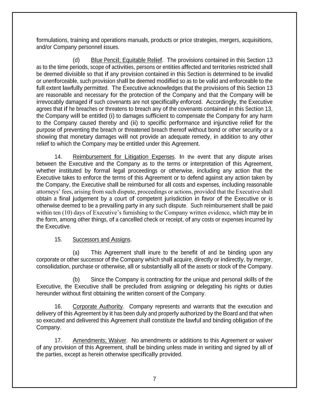 7 formulations, training and operations manuals, products or price strategies, mergers, acquisitions, and/or Company personnel issues. (d) Blue Pencil; Equitable Relief. The provisions contained in this Section 13 as to the time periods, scope of activities, persons or entities affected and territories restricted shall be deemed divisible so that if any provision contained in this Section is determined to be invalid or unenforceable, such provision shall be deemed modified so as to be valid and enforceable to the full extent lawfully permitted. The Executive acknowledges that the provisions of this Section 13 are reasonable and necessary for the protection of the Company and that the Company will be irrevocably damaged if such covenants are not specifically enforced. Accordingly, the Executive agrees that if he breaches or threatens to breach any of the covenants contained in this Section 13, the Company will be entitled (i) to damages sufficient to compensate the Company for any harm to the Company caused thereby and (ii) to specific performance and injunctive relief for the purpose of preventing the breach or threatened breach thereof without bond or other security or a showing that monetary damages will not provide an adequate remedy, in addition to any other relief to which the Company may be entitled under this Agreement. 14. Reimbursement for Litigation Expenses. In the event that any dispute arises between the Executive and the Company as to the terms or interpretation of this Agreement, whether instituted by formal legal proceedings or otherwise, including any action that the Executive takes to enforce the terms of this Agreement or to defend against any action taken by the Company, the Executive shall be reimbursed for all costs and expenses, including reasonable attorneys’ fees, arising from such dispute, proceedings or actions, provided that the Executive shall obtain a final judgement by a court of competent jurisdiction in favor of the Executive or is otherwise deemed to be a prevailing party in any such dispute. Such reimbursement shall be paid within ten (10) days of Executive’s furnishing to the Company written evidence, which may be in the form, among other things, of a cancelled check or receipt, of any costs or expenses incurred by the Executive. 15. Successors and Assigns. (a) This Agreement shall inure to the benefit of and be binding upon any corporate or other successor of the Company which shall acquire, directly or indirectly, by merger, consolidation, purchase or otherwise, all or substantially all of the assets or stock of the Company. (b) Since the Company is contracting for the unique and personal skills of the Executive, the Executive shall be precluded from assigning or delegating his rights or duties hereunder without first obtaining the written consent of the Company. 16. Corporate Authority. Company represents and warrants that the execution and delivery of this Agreement by it has been duly and properly authorized by the Board and that when so executed and delivered this Agreement shall constitute the lawful and binding obligation of the Company. 17. Amendments; Waiver. No amendments or additions to this Agreement or waiver of any provision of this Agreement, shall be binding unless made in writing and signed by all of the parties, except as herein otherwise specifically provided.