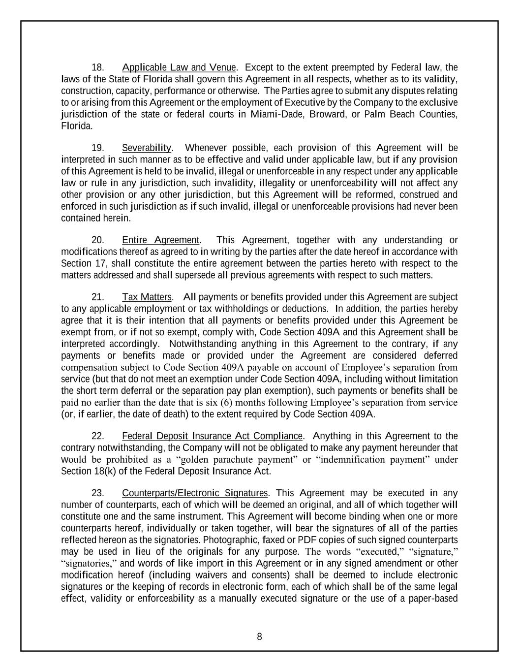 8 18. Applicable Law and Venue. Except to the extent preempted by Federal law, the laws of the State of Florida shall govern this Agreement in all respects, whether as to its validity, construction, capacity, performance or otherwise. The Parties agree to submit any disputes relating to or arising from this Agreement or the employment of Executive by the Company to the exclusive jurisdiction of the state or federal courts in Miami-Dade, Broward, or Palm Beach Counties, Florida. 19. Severability. Whenever possible, each provision of this Agreement will be interpreted in such manner as to be effective and valid under applicable law, but if any provision of this Agreement is held to be invalid, illegal or unenforceable in any respect under any applicable law or rule in any jurisdiction, such invalidity, illegality or unenforceability will not affect any other provision or any other jurisdiction, but this Agreement will be reformed, construed and enforced in such jurisdiction as if such invalid, illegal or unenforceable provisions had never been contained herein. 20. Entire Agreement. This Agreement, together with any understanding or modifications thereof as agreed to in writing by the parties after the date hereof in accordance with Section 17, shall constitute the entire agreement between the parties hereto with respect to the matters addressed and shall supersede all previous agreements with respect to such matters. 21. Tax Matters. All payments or benefits provided under this Agreement are subject to any applicable employment or tax withholdings or deductions. In addition, the parties hereby agree that it is their intention that all payments or benefits provided under this Agreement be exempt from, or if not so exempt, comply with, Code Section 409A and this Agreement shall be interpreted accordingly. Notwithstanding anything in this Agreement to the contrary, if any payments or benefits made or provided under the Agreement are considered deferred compensation subject to Code Section 409A payable on account of Employee’s separation from service (but that do not meet an exemption under Code Section 409A, including without limitation the short term deferral or the separation pay plan exemption), such payments or benefits shall be paid no earlier than the date that is six (6) months following Employee’s separation from service (or, if earlier, the date of death) to the extent required by Code Section 409A. 22. Federal Deposit Insurance Act Compliance. Anything in this Agreement to the contrary notwithstanding, the Company will not be obligated to make any payment hereunder that would be prohibited as a “golden parachute payment” or “indemnification payment” under Section 18(k) of the Federal Deposit Insurance Act. 23. Counterparts/Electronic Signatures. This Agreement may be executed in any number of counterparts, each of which will be deemed an original, and all of which together will constitute one and the same instrument. This Agreement will become binding when one or more counterparts hereof, individually or taken together, will bear the signatures of all of the parties reflected hereon as the signatories. Photographic, faxed or PDF copies of such signed counterparts may be used in lieu of the originals for any purpose. The words “executed,” “signature,” “signatories,” and words of like import in this Agreement or in any signed amendment or other modification hereof (including waivers and consents) shall be deemed to include electronic signatures or the keeping of records in electronic form, each of which shall be of the same legal effect, validity or enforceability as a manually executed signature or the use of a paper-based