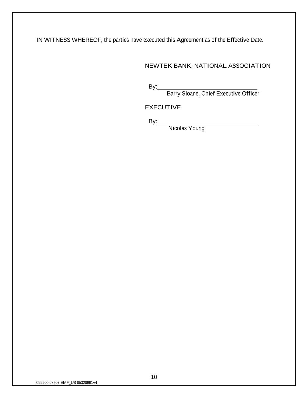 10 IN WITNESS WHEREOF, the parties have executed this Agreement as of the Effective Date. NEWTEK BANK, NATIONAL ASSOCIATION By: Barry Sloane, Chief Executive Officer EXECUTIVE By: Nicolas Young 099900.08507 EMF_US 85328991v4