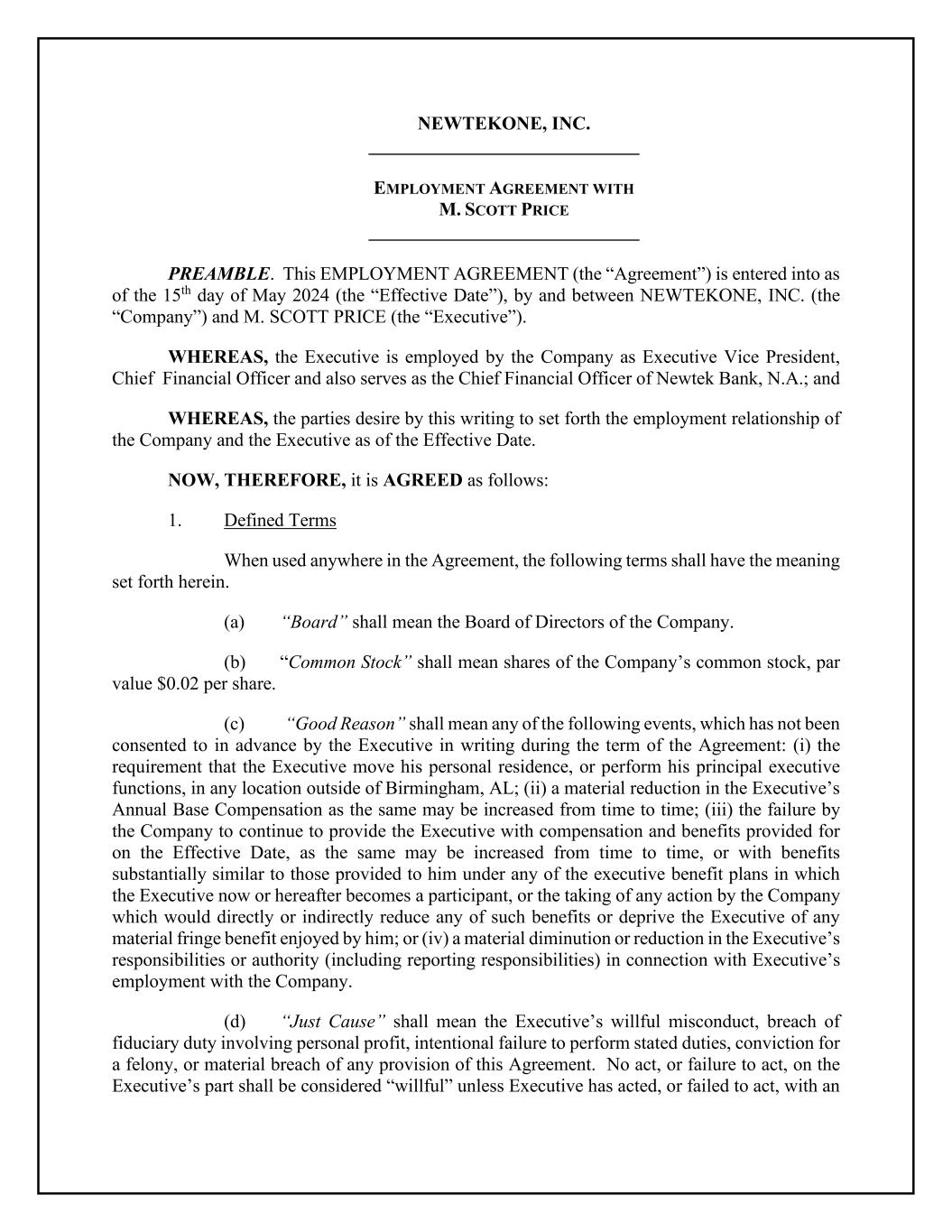 NEWTEKONE, INC. _____________________________ EMPLOYMENT AGREEMENT WITH M. SCOTT PRICE _____________________________ PREAMBLE. This EMPLOYMENT AGREEMENT (the “Agreement”) is entered into as of the 15th day of May 2024 (the “Effective Date”), by and between NEWTEKONE, INC. (the “Company”) and M. SCOTT PRICE (the “Executive”). WHEREAS, the Executive is employed by the Company as Executive Vice President, Chief Financial Officer and also serves as the Chief Financial Officer of Newtek Bank, N.A.; and WHEREAS, the parties desire by this writing to set forth the employment relationship of the Company and the Executive as of the Effective Date. NOW, THEREFORE, it is AGREED as follows: 1. Defined Terms When used anywhere in the Agreement, the following terms shall have the meaning set forth herein. (a) “Board” shall mean the Board of Directors of the Company. (b) “Common Stock” shall mean shares of the Company’s common stock, par value $0.02 per share. (c) “Good Reason” shall mean any of the following events, which has not been consented to in advance by the Executive in writing during the term of the Agreement: (i) the requirement that the Executive move his personal residence, or perform his principal executive functions, in any location outside of Birmingham, AL; (ii) a material reduction in the Executive’s Annual Base Compensation as the same may be increased from time to time; (iii) the failure by the Company to continue to provide the Executive with compensation and benefits provided for on the Effective Date, as the same may be increased from time to time, or with benefits substantially similar to those provided to him under any of the executive benefit plans in which the Executive now or hereafter becomes a participant, or the taking of any action by the Company which would directly or indirectly reduce any of such benefits or deprive the Executive of any material fringe benefit enjoyed by him; or (iv) a material diminution or reduction in the Executive’s responsibilities or authority (including reporting responsibilities) in connection with Executive’s employment with the Company. (d) “Just Cause” shall mean the Executive’s willful misconduct, breach of fiduciary duty involving personal profit, intentional failure to perform stated duties, conviction for a felony, or material breach of any provision of this Agreement. No act, or failure to act, on the Executive’s part shall be considered “willful” unless Executive has acted, or failed to act, with an