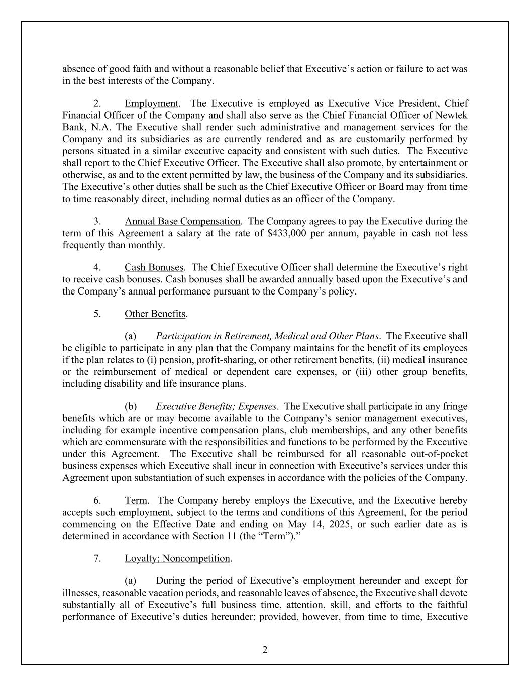 2 absence of good faith and without a reasonable belief that Executive’s action or failure to act was in the best interests of the Company. 2. Employment. The Executive is employed as Executive Vice President, Chief Financial Officer of the Company and shall also serve as the Chief Financial Officer of Newtek Bank, N.A. The Executive shall render such administrative and management services for the Company and its subsidiaries as are currently rendered and as are customarily performed by persons situated in a similar executive capacity and consistent with such duties. The Executive shall report to the Chief Executive Officer. The Executive shall also promote, by entertainment or otherwise, as and to the extent permitted by law, the business of the Company and its subsidiaries. The Executive’s other duties shall be such as the Chief Executive Officer or Board may from time to time reasonably direct, including normal duties as an officer of the Company. 3. Annual Base Compensation. The Company agrees to pay the Executive during the term of this Agreement a salary at the rate of $433,000 per annum, payable in cash not less frequently than monthly. 4. Cash Bonuses. The Chief Executive Officer shall determine the Executive’s right to receive cash bonuses. Cash bonuses shall be awarded annually based upon the Executive’s and the Company’s annual performance pursuant to the Company’s policy. 5. Other Benefits. (a) Participation in Retirement, Medical and Other Plans. The Executive shall be eligible to participate in any plan that the Company maintains for the benefit of its employees if the plan relates to (i) pension, profit-sharing, or other retirement benefits, (ii) medical insurance or the reimbursement of medical or dependent care expenses, or (iii) other group benefits, including disability and life insurance plans. (b) Executive Benefits; Expenses. The Executive shall participate in any fringe benefits which are or may become available to the Company’s senior management executives, including for example incentive compensation plans, club memberships, and any other benefits which are commensurate with the responsibilities and functions to be performed by the Executive under this Agreement. The Executive shall be reimbursed for all reasonable out-of-pocket business expenses which Executive shall incur in connection with Executive’s services under this Agreement upon substantiation of such expenses in accordance with the policies of the Company. 6. Term. The Company hereby employs the Executive, and the Executive hereby accepts such employment, subject to the terms and conditions of this Agreement, for the period commencing on the Effective Date and ending on May 14, 2025, or such earlier date as is determined in accordance with Section 11 (the “Term”).” 7. Loyalty; Noncompetition. (a) During the period of Executive’s employment hereunder and except for illnesses, reasonable vacation periods, and reasonable leaves of absence, the Executive shall devote substantially all of Executive’s full business time, attention, skill, and efforts to the faithful performance of Executive’s duties hereunder; provided, however, from time to time, Executive