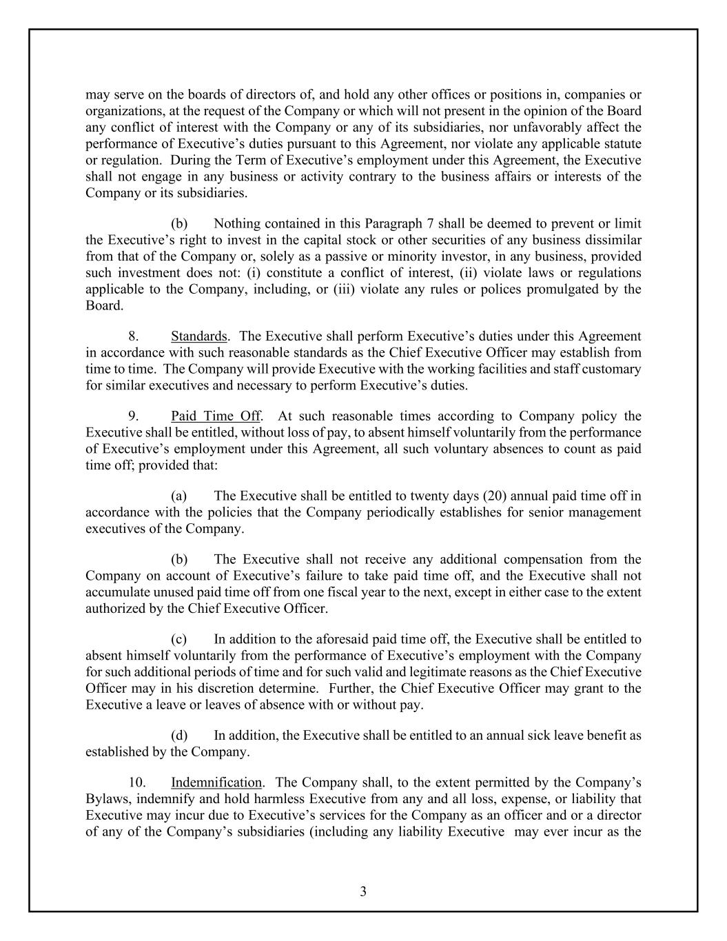 3 may serve on the boards of directors of, and hold any other offices or positions in, companies or organizations, at the request of the Company or which will not present in the opinion of the Board any conflict of interest with the Company or any of its subsidiaries, nor unfavorably affect the performance of Executive’s duties pursuant to this Agreement, nor violate any applicable statute or regulation. During the Term of Executive’s employment under this Agreement, the Executive shall not engage in any business or activity contrary to the business affairs or interests of the Company or its subsidiaries. (b) Nothing contained in this Paragraph 7 shall be deemed to prevent or limit the Executive’s right to invest in the capital stock or other securities of any business dissimilar from that of the Company or, solely as a passive or minority investor, in any business, provided such investment does not: (i) constitute a conflict of interest, (ii) violate laws or regulations applicable to the Company, including, or (iii) violate any rules or polices promulgated by the Board. 8. Standards. The Executive shall perform Executive’s duties under this Agreement in accordance with such reasonable standards as the Chief Executive Officer may establish from time to time. The Company will provide Executive with the working facilities and staff customary for similar executives and necessary to perform Executive’s duties. 9. Paid Time Off. At such reasonable times according to Company policy the Executive shall be entitled, without loss of pay, to absent himself voluntarily from the performance of Executive’s employment under this Agreement, all such voluntary absences to count as paid time off; provided that: (a) The Executive shall be entitled to twenty days (20) annual paid time off in accordance with the policies that the Company periodically establishes for senior management executives of the Company. (b) The Executive shall not receive any additional compensation from the Company on account of Executive’s failure to take paid time off, and the Executive shall not accumulate unused paid time off from one fiscal year to the next, except in either case to the extent authorized by the Chief Executive Officer. (c) In addition to the aforesaid paid time off, the Executive shall be entitled to absent himself voluntarily from the performance of Executive’s employment with the Company for such additional periods of time and for such valid and legitimate reasons as the Chief Executive Officer may in his discretion determine. Further, the Chief Executive Officer may grant to the Executive a leave or leaves of absence with or without pay. (d) In addition, the Executive shall be entitled to an annual sick leave benefit as established by the Company. 10. Indemnification. The Company shall, to the extent permitted by the Company’s Bylaws, indemnify and hold harmless Executive from any and all loss, expense, or liability that Executive may incur due to Executive’s services for the Company as an officer and or a director of any of the Company’s subsidiaries (including any liability Executive may ever incur as the