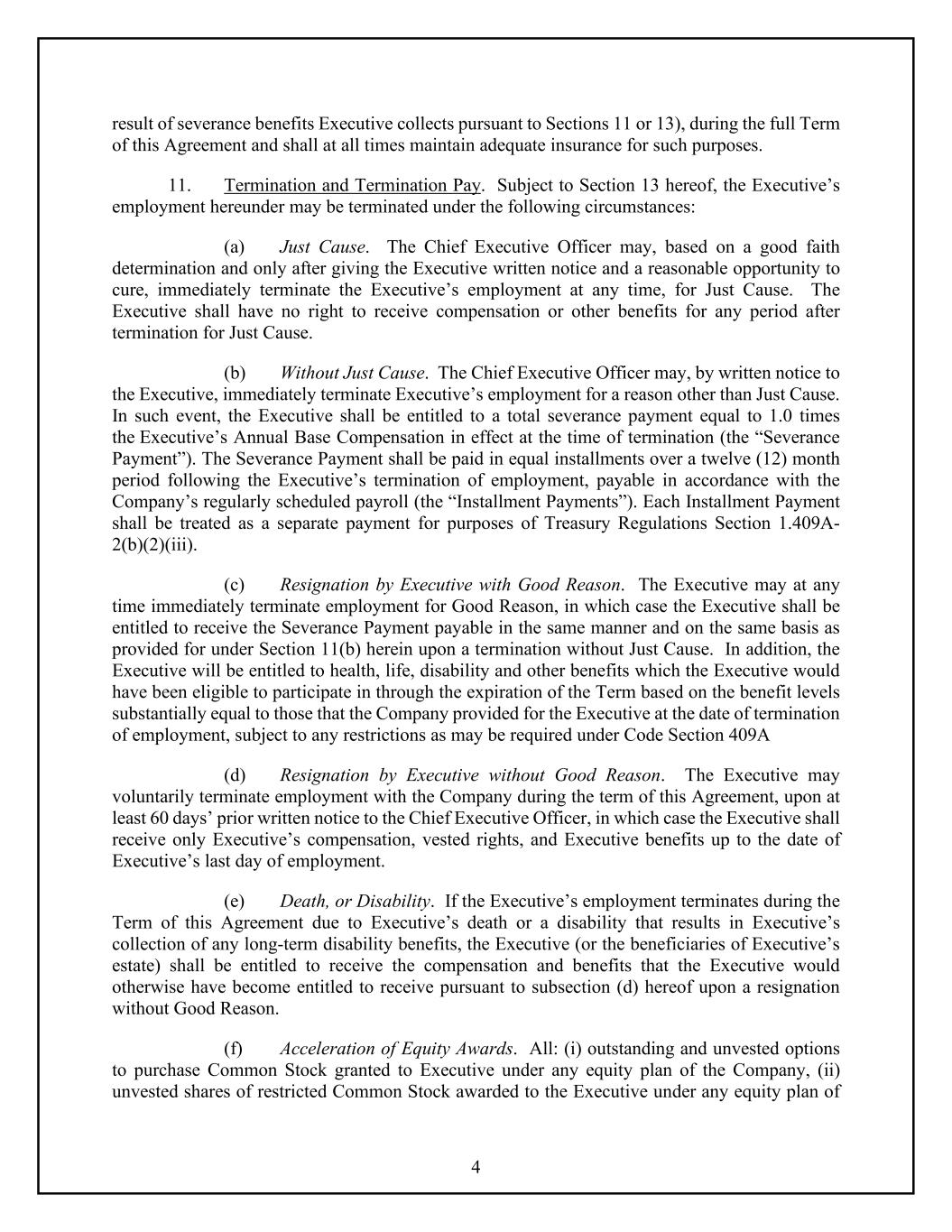 4 result of severance benefits Executive collects pursuant to Sections 11 or 13), during the full Term of this Agreement and shall at all times maintain adequate insurance for such purposes. 11. Termination and Termination Pay. Subject to Section 13 hereof, the Executive’s employment hereunder may be terminated under the following circumstances: (a) Just Cause. The Chief Executive Officer may, based on a good faith determination and only after giving the Executive written notice and a reasonable opportunity to cure, immediately terminate the Executive’s employment at any time, for Just Cause. The Executive shall have no right to receive compensation or other benefits for any period after termination for Just Cause. (b) Without Just Cause. The Chief Executive Officer may, by written notice to the Executive, immediately terminate Executive’s employment for a reason other than Just Cause. In such event, the Executive shall be entitled to a total severance payment equal to 1.0 times the Executive’s Annual Base Compensation in effect at the time of termination (the “Severance Payment”). The Severance Payment shall be paid in equal installments over a twelve (12) month period following the Executive’s termination of employment, payable in accordance with the Company’s regularly scheduled payroll (the “Installment Payments”). Each Installment Payment shall be treated as a separate payment for purposes of Treasury Regulations Section 1.409A- 2(b)(2)(iii). (c) Resignation by Executive with Good Reason. The Executive may at any time immediately terminate employment for Good Reason, in which case the Executive shall be entitled to receive the Severance Payment payable in the same manner and on the same basis as provided for under Section 11(b) herein upon a termination without Just Cause. In addition, the Executive will be entitled to health, life, disability and other benefits which the Executive would have been eligible to participate in through the expiration of the Term based on the benefit levels substantially equal to those that the Company provided for the Executive at the date of termination of employment, subject to any restrictions as may be required under Code Section 409A (d) Resignation by Executive without Good Reason. The Executive may voluntarily terminate employment with the Company during the term of this Agreement, upon at least 60 days’ prior written notice to the Chief Executive Officer, in which case the Executive shall receive only Executive’s compensation, vested rights, and Executive benefits up to the date of Executive’s last day of employment. (e) Death, or Disability. If the Executive’s employment terminates during the Term of this Agreement due to Executive’s death or a disability that results in Executive’s collection of any long-term disability benefits, the Executive (or the beneficiaries of Executive’s estate) shall be entitled to receive the compensation and benefits that the Executive would otherwise have become entitled to receive pursuant to subsection (d) hereof upon a resignation without Good Reason. (f) Acceleration of Equity Awards. All: (i) outstanding and unvested options to purchase Common Stock granted to Executive under any equity plan of the Company, (ii) unvested shares of restricted Common Stock awarded to the Executive under any equity plan of