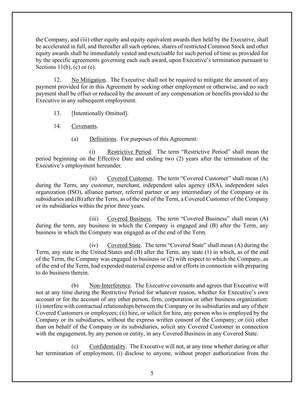 5 the Company, and (iii) other equity and equity equivalent awards then held by the Executive, shall be accelerated in full, and thereafter all such options, shares of restricted Common Stock and other equity awards shall be immediately vested and exercisable for such period of time as provided for by the specific agreements governing each such award, upon Executive’s termination pursuant to Sections 11(b), (c) or (e). 12. No Mitigation. The Executive shall not be required to mitigate the amount of any payment provided for in this Agreement by seeking other employment or otherwise, and no such payment shall be offset or reduced by the amount of any compensation or benefits provided to the Executive in any subsequent employment. 13. [Intentionally Omitted]. 14. Covenants. (a) Definitions. For purposes of this Agreement: (i) Restrictive Period. The term “Restrictive Period” shall mean the period beginning on the Effective Date and ending two (2) years after the termination of the Executive’s employment hereunder. (ii) Covered Customer. The term “Covered Customer” shall mean (A) during the Term, any customer, merchant, independent sales agency (ISA), independent sales organization (ISO), alliance partner, referral partner or any intermediary of the Company or its subsidiaries and (B) after the Term, as of the end of the Term, a Covered Customer of the Company or its subsidiaries within the prior three years. (iii) Covered Business. The term “Covered Business” shall mean (A) during the term, any business in which the Company is engaged and (B) after the Term, any business in which the Company was engaged as of the end of the Term. (iv) Covered State. The term “Covered State” shall mean (A) during the Term, any state in the United States and (B) after the Term, any state (1) in which, as of the end of the Term, the Company was engaged in business or (2) with respect to which the Company, as of the end of the Term, had expended material expense and/or efforts in connection with preparing to do business therein. (b) Non-Interference. The Executive covenants and agrees that Executive will not at any time during the Restrictive Period for whatever reason, whether for Executive’s own account or for the account of any other person, firm, corporation or other business organization: (i) interfere with contractual relationships between the Company or its subsidiaries and any of their Covered Customers or employees; (ii) hire, or solicit for hire, any person who is employed by the Company or its subsidiaries, without the express written consent of the Company; or (iii) other than on behalf of the Company or its subsidiaries, solicit any Covered Customer in connection with the engagement, by any person or entity, in any Covered Business in any Covered State. (c) Confidentiality. The Executive will not, at any time whether during or after her termination of employment, (i) disclose to anyone, without proper authorization from the