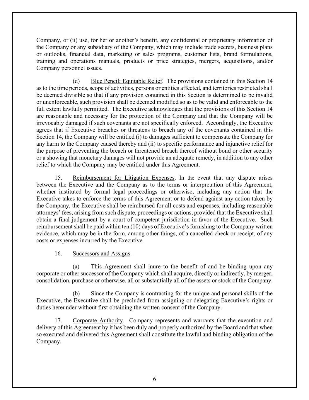 6 Company, or (ii) use, for her or another’s benefit, any confidential or proprietary information of the Company or any subsidiary of the Company, which may include trade secrets, business plans or outlooks, financial data, marketing or sales programs, customer lists, brand formulations, training and operations manuals, products or price strategies, mergers, acquisitions, and/or Company personnel issues. (d) Blue Pencil; Equitable Relief. The provisions contained in this Section 14 as to the time periods, scope of activities, persons or entities affected, and territories restricted shall be deemed divisible so that if any provision contained in this Section is determined to be invalid or unenforceable, such provision shall be deemed modified so as to be valid and enforceable to the full extent lawfully permitted. The Executive acknowledges that the provisions of this Section 14 are reasonable and necessary for the protection of the Company and that the Company will be irrevocably damaged if such covenants are not specifically enforced. Accordingly, the Executive agrees that if Executive breaches or threatens to breach any of the covenants contained in this Section 14, the Company will be entitled (i) to damages sufficient to compensate the Company for any harm to the Company caused thereby and (ii) to specific performance and injunctive relief for the purpose of preventing the breach or threatened breach thereof without bond or other security or a showing that monetary damages will not provide an adequate remedy, in addition to any other relief to which the Company may be entitled under this Agreement. 15. Reimbursement for Litigation Expenses. In the event that any dispute arises between the Executive and the Company as to the terms or interpretation of this Agreement, whether instituted by formal legal proceedings or otherwise, including any action that the Executive takes to enforce the terms of this Agreement or to defend against any action taken by the Company, the Executive shall be reimbursed for all costs and expenses, including reasonable attorneys’ fees, arising from such dispute, proceedings or actions, provided that the Executive shall obtain a final judgement by a court of competent jurisdiction in favor of the Executive. Such reimbursement shall be paid within ten (10) days of Executive’s furnishing to the Company written evidence, which may be in the form, among other things, of a cancelled check or receipt, of any costs or expenses incurred by the Executive. 16. Successors and Assigns. (a) This Agreement shall inure to the benefit of and be binding upon any corporate or other successor of the Company which shall acquire, directly or indirectly, by merger, consolidation, purchase or otherwise, all or substantially all of the assets or stock of the Company. (b) Since the Company is contracting for the unique and personal skills of the Executive, the Executive shall be precluded from assigning or delegating Executive’s rights or duties hereunder without first obtaining the written consent of the Company. 17. Corporate Authority. Company represents and warrants that the execution and delivery of this Agreement by it has been duly and properly authorized by the Board and that when so executed and delivered this Agreement shall constitute the lawful and binding obligation of the Company.