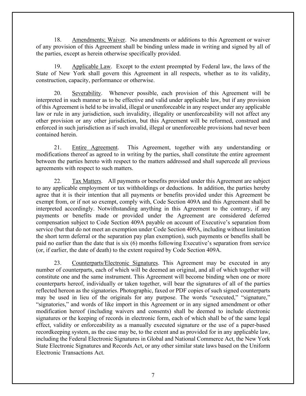 7 18. Amendments; Waiver. No amendments or additions to this Agreement or waiver of any provision of this Agreement shall be binding unless made in writing and signed by all of the parties, except as herein otherwise specifically provided. 19. Applicable Law. Except to the extent preempted by Federal law, the laws of the State of New York shall govern this Agreement in all respects, whether as to its validity, construction, capacity, performance or otherwise. 20. Severability. Whenever possible, each provision of this Agreement will be interpreted in such manner as to be effective and valid under applicable law, but if any provision of this Agreement is held to be invalid, illegal or unenforceable in any respect under any applicable law or rule in any jurisdiction, such invalidity, illegality or unenforceability will not affect any other provision or any other jurisdiction, but this Agreement will be reformed, construed and enforced in such jurisdiction as if such invalid, illegal or unenforceable provisions had never been contained herein. 21. Entire Agreement. This Agreement, together with any understanding or modifications thereof as agreed to in writing by the parties, shall constitute the entire agreement between the parties hereto with respect to the matters addressed and shall supercede all previous agreements with respect to such matters. 22. Tax Matters. All payments or benefits provided under this Agreement are subject to any applicable employment or tax withholdings or deductions. In addition, the parties hereby agree that it is their intention that all payments or benefits provided under this Agreement be exempt from, or if not so exempt, comply with, Code Section 409A and this Agreement shall be interpreted accordingly. Notwithstanding anything in this Agreement to the contrary, if any payments or benefits made or provided under the Agreement are considered deferred compensation subject to Code Section 409A payable on account of Executive’s separation from service (but that do not meet an exemption under Code Section 409A, including without limitation the short term deferral or the separation pay plan exemption), such payments or benefits shall be paid no earlier than the date that is six (6) months following Executive’s separation from service (or, if earlier, the date of death) to the extent required by Code Section 409A. 23. Counterparts/Electronic Signatures. This Agreement may be executed in any number of counterparts, each of which will be deemed an original, and all of which together will constitute one and the same instrument. This Agreement will become binding when one or more counterparts hereof, individually or taken together, will bear the signatures of all of the parties reflected hereon as the signatories. Photographic, faxed or PDF copies of such signed counterparts may be used in lieu of the originals for any purpose. The words “executed,” “signature,” “signatories,” and words of like import in this Agreement or in any signed amendment or other modification hereof (including waivers and consents) shall be deemed to include electronic signatures or the keeping of records in electronic form, each of which shall be of the same legal effect, validity or enforceability as a manually executed signature or the use of a paper-based recordkeeping system, as the case may be, to the extent and as provided for in any applicable law, including the Federal Electronic Signatures in Global and National Commerce Act, the New York State Electronic Signatures and Records Act, or any other similar state laws based on the Uniform Electronic Transactions Act.