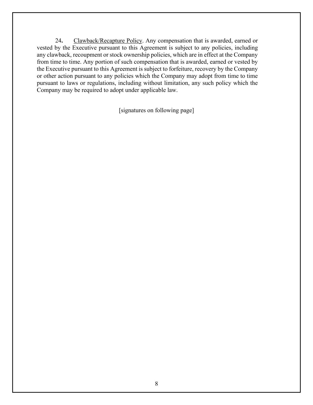 8 24. Clawback/Recapture Policy. Any compensation that is awarded, earned or vested by the Executive pursuant to this Agreement is subject to any policies, including any clawback, recoupment or stock ownership policies, which are in effect at the Company from time to time. Any portion of such compensation that is awarded, earned or vested by the Executive pursuant to this Agreement is subject to forfeiture, recovery by the Company or other action pursuant to any policies which the Company may adopt from time to time pursuant to laws or regulations, including without limitation, any such policy which the Company may be required to adopt under applicable law. [signatures on following page]