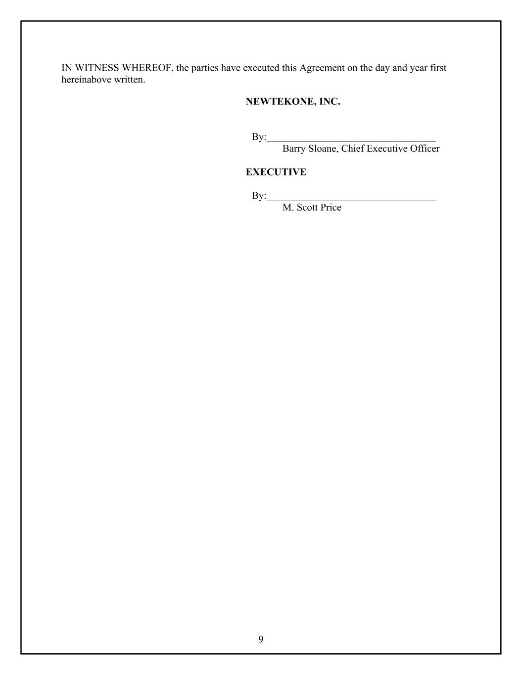 9 IN WITNESS WHEREOF, the parties have executed this Agreement on the day and year first hereinabove written. NEWTEKONE, INC. By: Barry Sloane, Chief Executive Officer EXECUTIVE By: M. Scott Price
