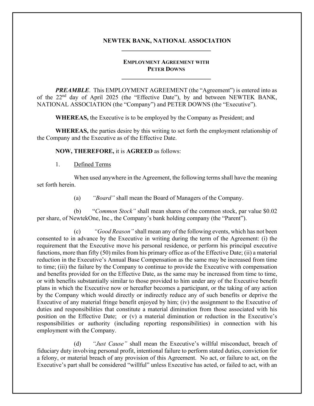 NEWTEK BANK, NATIONAL ASSOCIATION _____________________________ EMPLOYMENT AGREEMENT WITH PETER DOWNS _____________________________ PREAMBLE. This EMPLOYMENT AGREEMENT (the “Agreement”) is entered into as of the 22nd day of April 2025 (the “Effective Date”), by and between NEWTEK BANK, NATIONAL ASSOCIATION (the “Company”) and PETER DOWNS (the “Executive”). WHEREAS, the Executive is to be employed by the Company as President; and WHEREAS, the parties desire by this writing to set forth the employment relationship of the Company and the Executive as of the Effective Date. NOW, THEREFORE, it is AGREED as follows: 1. Defined Terms When used anywhere in the Agreement, the following terms shall have the meaning set forth herein. (a) “Board” shall mean the Board of Managers of the Company. (b) “Common Stock” shall mean shares of the common stock, par value $0.02 per share, of NewtekOne, Inc., the Company’s bank holding company (the “Parent”). (c) “Good Reason” shall mean any of the following events, which has not been consented to in advance by the Executive in writing during the term of the Agreement: (i) the requirement that the Executive move his personal residence, or perform his principal executive functions, more than fifty (50) miles from his primary office as of the Effective Date; (ii) a material reduction in the Executive’s Annual Base Compensation as the same may be increased from time to time; (iii) the failure by the Company to continue to provide the Executive with compensation and benefits provided for on the Effective Date, as the same may be increased from time to time, or with benefits substantially similar to those provided to him under any of the Executive benefit plans in which the Executive now or hereafter becomes a participant, or the taking of any action by the Company which would directly or indirectly reduce any of such benefits or deprive the Executive of any material fringe benefit enjoyed by him; (iv) the assignment to the Executive of duties and responsibilities that constitute a material diminution from those associated with his position on the Effective Date; or (v) a material diminution or reduction in the Executive’s responsibilities or authority (including reporting responsibilities) in connection with his employment with the Company. (d) “Just Cause” shall mean the Executive’s willful misconduct, breach of fiduciary duty involving personal profit, intentional failure to perform stated duties, conviction for a felony, or material breach of any provision of this Agreement. No act, or failure to act, on the Executive’s part shall be considered “willful” unless Executive has acted, or failed to act, with an
