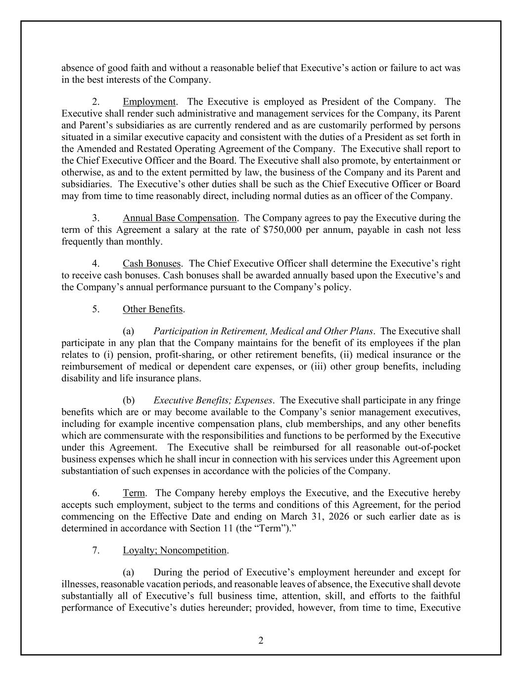 2 absence of good faith and without a reasonable belief that Executive’s action or failure to act was in the best interests of the Company. 2. Employment. The Executive is employed as President of the Company. The Executive shall render such administrative and management services for the Company, its Parent and Parent’s subsidiaries as are currently rendered and as are customarily performed by persons situated in a similar executive capacity and consistent with the duties of a President as set forth in the Amended and Restated Operating Agreement of the Company. The Executive shall report to the Chief Executive Officer and the Board. The Executive shall also promote, by entertainment or otherwise, as and to the extent permitted by law, the business of the Company and its Parent and subsidiaries. The Executive’s other duties shall be such as the Chief Executive Officer or Board may from time to time reasonably direct, including normal duties as an officer of the Company. 3. Annual Base Compensation. The Company agrees to pay the Executive during the term of this Agreement a salary at the rate of $750,000 per annum, payable in cash not less frequently than monthly. 4. Cash Bonuses. The Chief Executive Officer shall determine the Executive’s right to receive cash bonuses. Cash bonuses shall be awarded annually based upon the Executive’s and the Company’s annual performance pursuant to the Company’s policy. 5. Other Benefits. (a) Participation in Retirement, Medical and Other Plans. The Executive shall participate in any plan that the Company maintains for the benefit of its employees if the plan relates to (i) pension, profit-sharing, or other retirement benefits, (ii) medical insurance or the reimbursement of medical or dependent care expenses, or (iii) other group benefits, including disability and life insurance plans. (b) Executive Benefits; Expenses. The Executive shall participate in any fringe benefits which are or may become available to the Company’s senior management executives, including for example incentive compensation plans, club memberships, and any other benefits which are commensurate with the responsibilities and functions to be performed by the Executive under this Agreement. The Executive shall be reimbursed for all reasonable out-of-pocket business expenses which he shall incur in connection with his services under this Agreement upon substantiation of such expenses in accordance with the policies of the Company. 6. Term. The Company hereby employs the Executive, and the Executive hereby accepts such employment, subject to the terms and conditions of this Agreement, for the period commencing on the Effective Date and ending on March 31, 2026 or such earlier date as is determined in accordance with Section 11 (the “Term”).” 7. Loyalty; Noncompetition. (a) During the period of Executive’s employment hereunder and except for illnesses, reasonable vacation periods, and reasonable leaves of absence, the Executive shall devote substantially all of Executive’s full business time, attention, skill, and efforts to the faithful performance of Executive’s duties hereunder; provided, however, from time to time, Executive