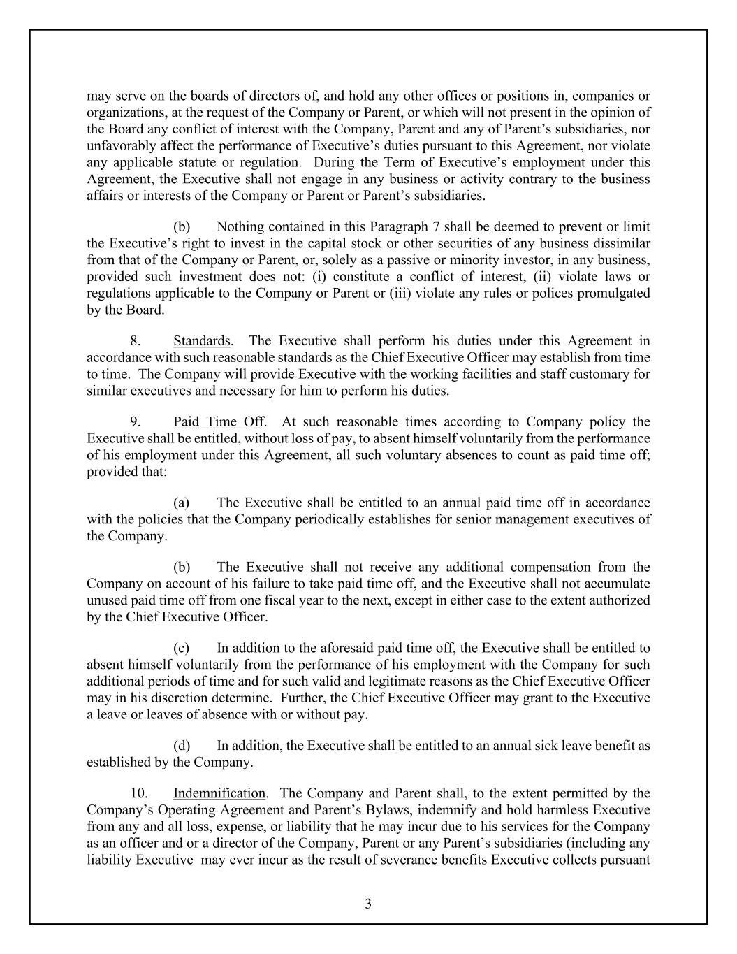3 may serve on the boards of directors of, and hold any other offices or positions in, companies or organizations, at the request of the Company or Parent, or which will not present in the opinion of the Board any conflict of interest with the Company, Parent and any of Parent’s subsidiaries, nor unfavorably affect the performance of Executive’s duties pursuant to this Agreement, nor violate any applicable statute or regulation. During the Term of Executive’s employment under this Agreement, the Executive shall not engage in any business or activity contrary to the business affairs or interests of the Company or Parent or Parent’s subsidiaries. (b) Nothing contained in this Paragraph 7 shall be deemed to prevent or limit the Executive’s right to invest in the capital stock or other securities of any business dissimilar from that of the Company or Parent, or, solely as a passive or minority investor, in any business, provided such investment does not: (i) constitute a conflict of interest, (ii) violate laws or regulations applicable to the Company or Parent or (iii) violate any rules or polices promulgated by the Board. 8. Standards. The Executive shall perform his duties under this Agreement in accordance with such reasonable standards as the Chief Executive Officer may establish from time to time. The Company will provide Executive with the working facilities and staff customary for similar executives and necessary for him to perform his duties. 9. Paid Time Off. At such reasonable times according to Company policy the Executive shall be entitled, without loss of pay, to absent himself voluntarily from the performance of his employment under this Agreement, all such voluntary absences to count as paid time off; provided that: (a) The Executive shall be entitled to an annual paid time off in accordance with the policies that the Company periodically establishes for senior management executives of the Company. (b) The Executive shall not receive any additional compensation from the Company on account of his failure to take paid time off, and the Executive shall not accumulate unused paid time off from one fiscal year to the next, except in either case to the extent authorized by the Chief Executive Officer. (c) In addition to the aforesaid paid time off, the Executive shall be entitled to absent himself voluntarily from the performance of his employment with the Company for such additional periods of time and for such valid and legitimate reasons as the Chief Executive Officer may in his discretion determine. Further, the Chief Executive Officer may grant to the Executive a leave or leaves of absence with or without pay. (d) In addition, the Executive shall be entitled to an annual sick leave benefit as established by the Company. 10. Indemnification. The Company and Parent shall, to the extent permitted by the Company’s Operating Agreement and Parent’s Bylaws, indemnify and hold harmless Executive from any and all loss, expense, or liability that he may incur due to his services for the Company as an officer and or a director of the Company, Parent or any Parent’s subsidiaries (including any liability Executive may ever incur as the result of severance benefits Executive collects pursuant