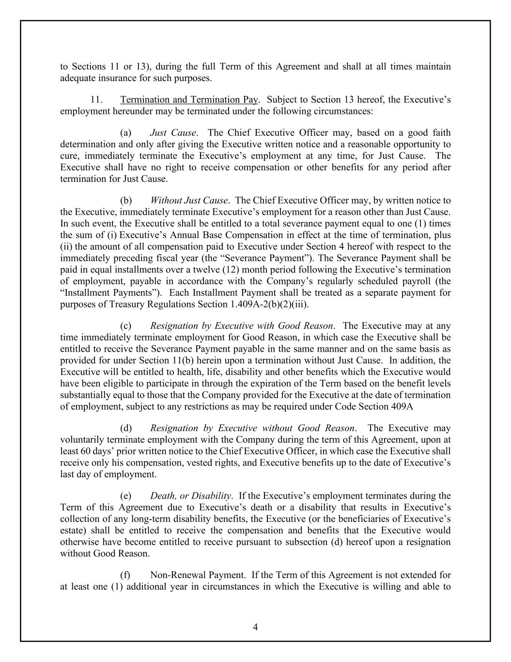 4 to Sections 11 or 13), during the full Term of this Agreement and shall at all times maintain adequate insurance for such purposes. 11. Termination and Termination Pay. Subject to Section 13 hereof, the Executive’s employment hereunder may be terminated under the following circumstances: (a) Just Cause. The Chief Executive Officer may, based on a good faith determination and only after giving the Executive written notice and a reasonable opportunity to cure, immediately terminate the Executive’s employment at any time, for Just Cause. The Executive shall have no right to receive compensation or other benefits for any period after termination for Just Cause. (b) Without Just Cause. The Chief Executive Officer may, by written notice to the Executive, immediately terminate Executive’s employment for a reason other than Just Cause. In such event, the Executive shall be entitled to a total severance payment equal to one (1) times the sum of (i) Executive’s Annual Base Compensation in effect at the time of termination, plus (ii) the amount of all compensation paid to Executive under Section 4 hereof with respect to the immediately preceding fiscal year (the “Severance Payment”). The Severance Payment shall be paid in equal installments over a twelve (12) month period following the Executive’s termination of employment, payable in accordance with the Company’s regularly scheduled payroll (the “Installment Payments”). Each Installment Payment shall be treated as a separate payment for purposes of Treasury Regulations Section 1.409A-2(b)(2)(iii). (c) Resignation by Executive with Good Reason. The Executive may at any time immediately terminate employment for Good Reason, in which case the Executive shall be entitled to receive the Severance Payment payable in the same manner and on the same basis as provided for under Section 11(b) herein upon a termination without Just Cause. In addition, the Executive will be entitled to health, life, disability and other benefits which the Executive would have been eligible to participate in through the expiration of the Term based on the benefit levels substantially equal to those that the Company provided for the Executive at the date of termination of employment, subject to any restrictions as may be required under Code Section 409A (d) Resignation by Executive without Good Reason. The Executive may voluntarily terminate employment with the Company during the term of this Agreement, upon at least 60 days’ prior written notice to the Chief Executive Officer, in which case the Executive shall receive only his compensation, vested rights, and Executive benefits up to the date of Executive’s last day of employment. (e) Death, or Disability. If the Executive’s employment terminates during the Term of this Agreement due to Executive’s death or a disability that results in Executive’s collection of any long-term disability benefits, the Executive (or the beneficiaries of Executive’s estate) shall be entitled to receive the compensation and benefits that the Executive would otherwise have become entitled to receive pursuant to subsection (d) hereof upon a resignation without Good Reason. (f) Non-Renewal Payment. If the Term of this Agreement is not extended for at least one (1) additional year in circumstances in which the Executive is willing and able to